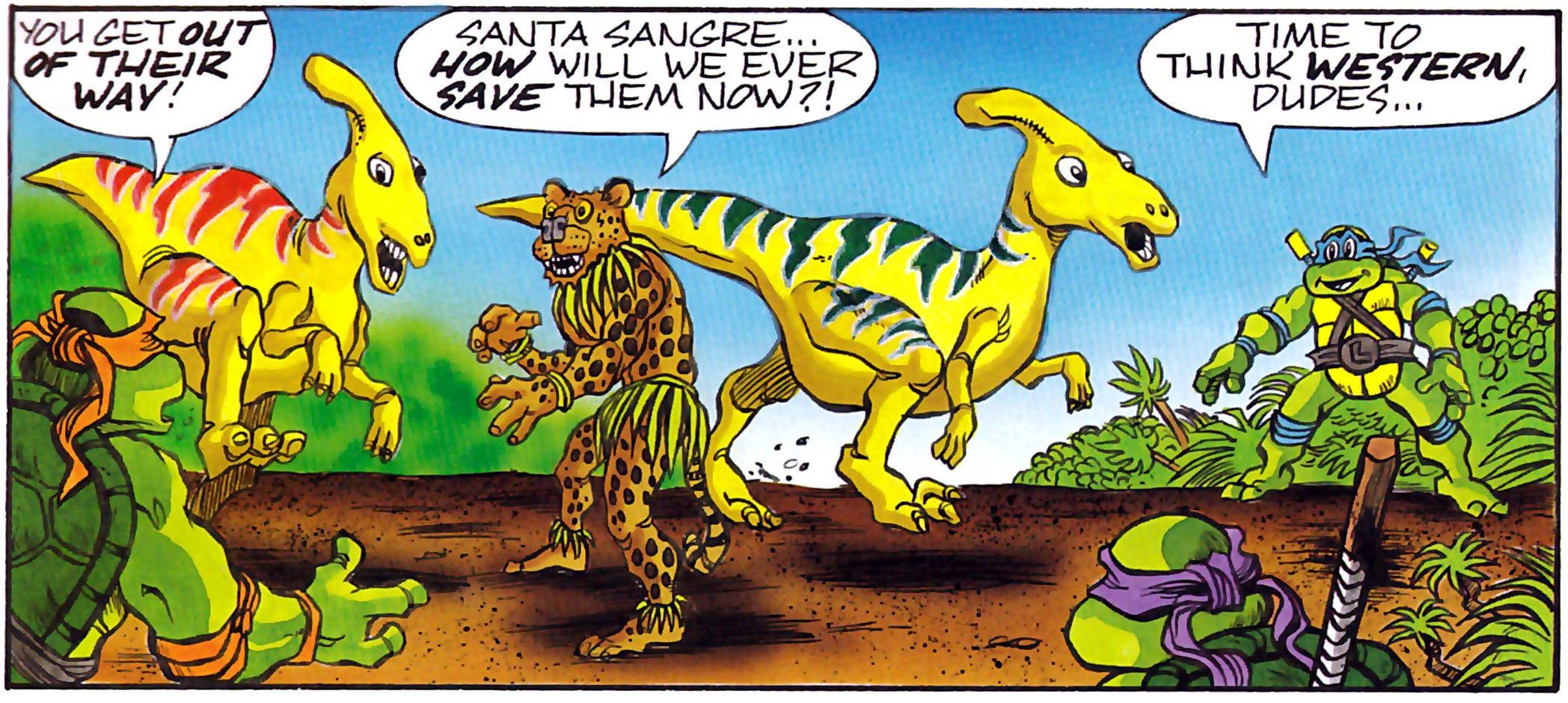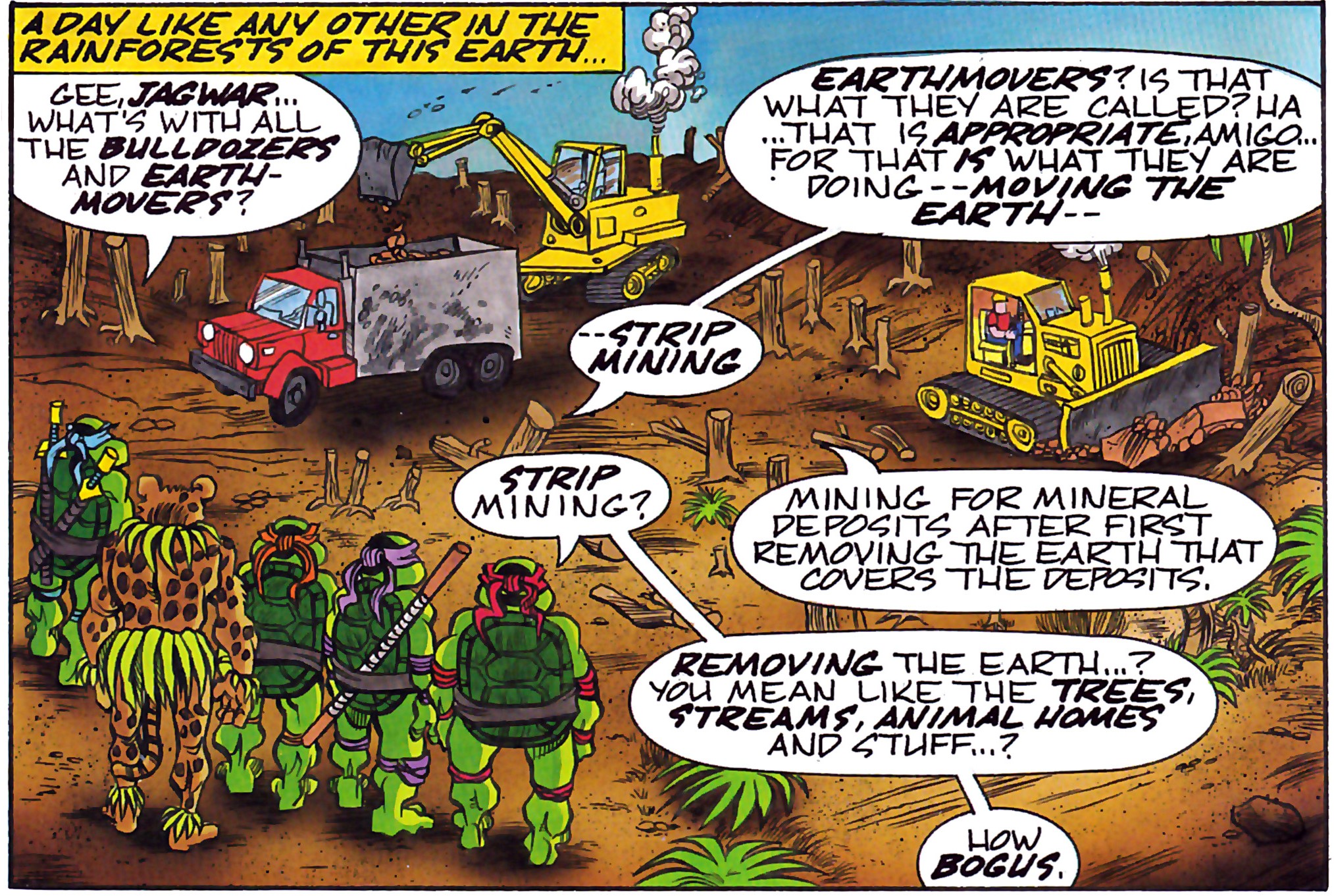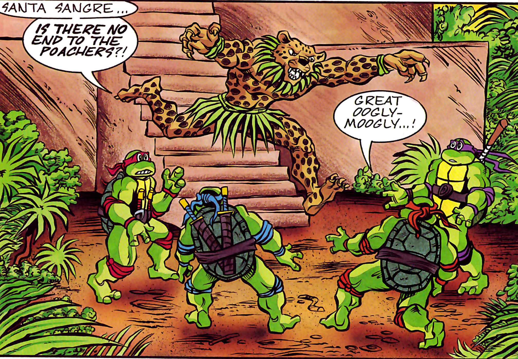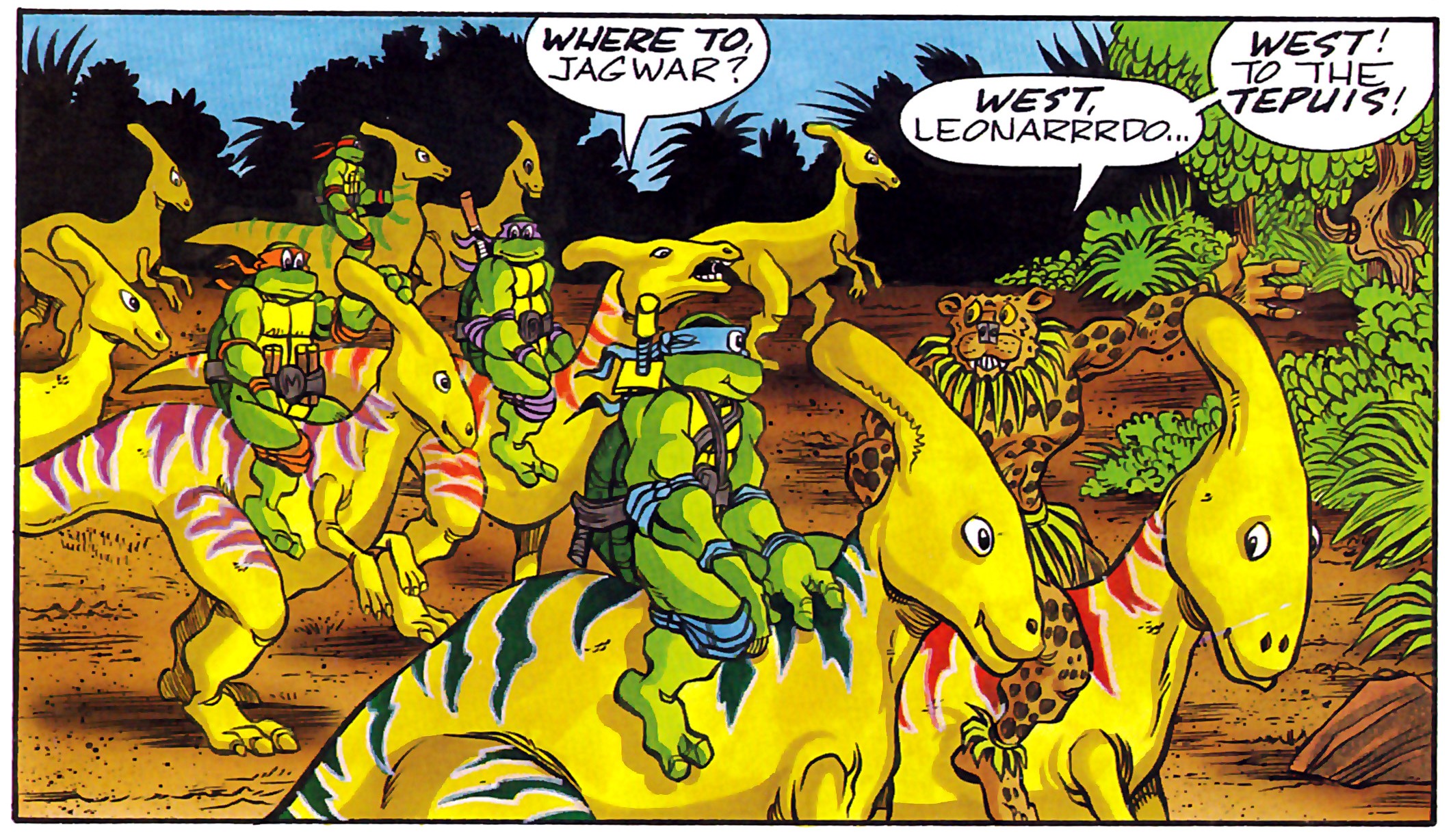 Les tortues retrouvèrent Jagwar dans la forêt amazonienne alors qu’elles traquaient des braconniers d’ocelots. S’approchant de son temps, elles furent attaquées par le félin. Il venait de neutraliser les braconniers pour relâcher les ocelots et prenait les ninjas pour des renforts des hommes appréhendés (TMNT Magazine #5). Par la suite, il les amena vers une zone où une mine à ciel ouvert se préparait. Il demandait de l’aide aux tortues pour déplacer un troupeau de Parasaurolophus, des dinosaures herbivores, en direction de tepuys pour les mettre à l’abri (TMNT Magazine #6).