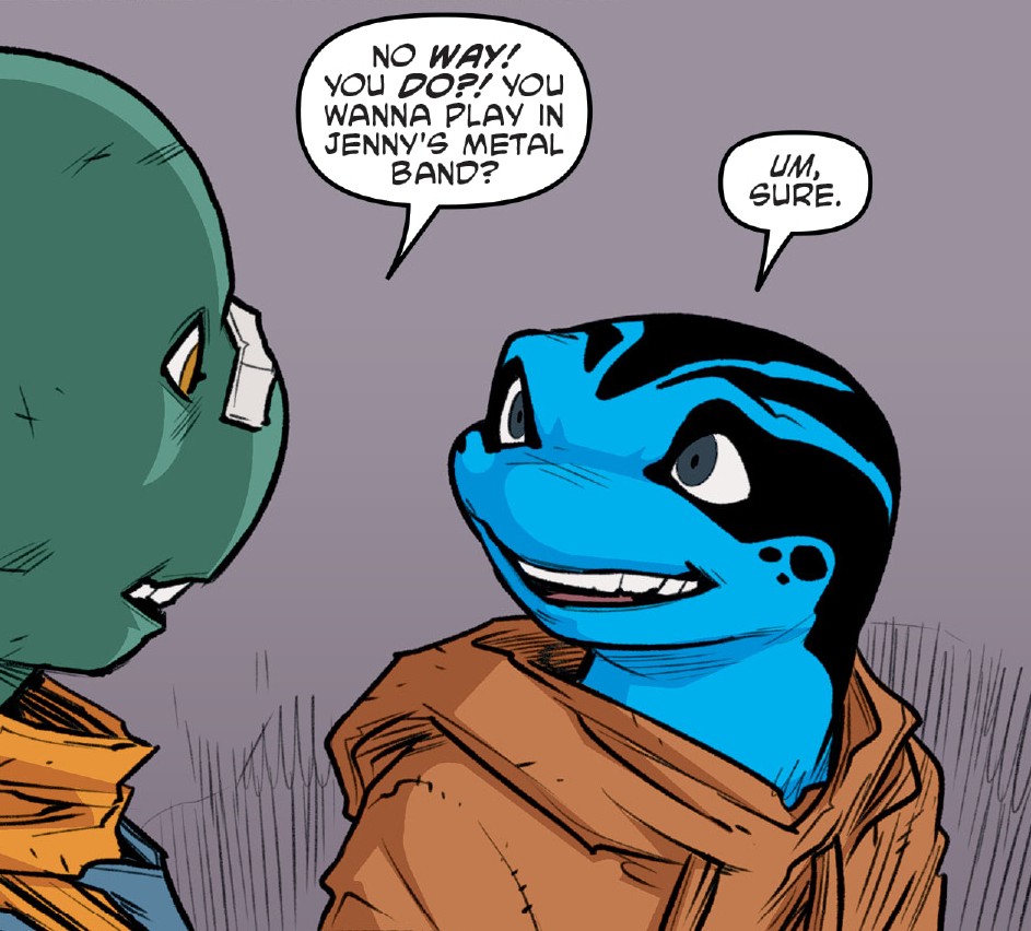 Michelangelo était confus et comprenait le geste de désespoir de Jay et ne lui en voulait pas. La grenouille s’était rapprochée de Sally Pride et de Mona Lisa pour faire bouger les choses. Ils placardaient des affiches dans les rues et cherchaient à mobiliser les citoyens pour amoindrir l’influence des Mutanimals. Un jour, Michelangelo vint les trouver pour leur proposer de rejoindre le groupe de musique de Jennika. Leur amie avait parié le Kennel Klub face à Bebop et Rocksteady pour les mettre dehors. Jay acceptait de se joindre au groupe (TMNT (Vol. 5) #116) et joua si bien avec son groupe qu’ils réussirent à mettre leurs rivaux en déroute (TMNT (Vol. 5) #117).