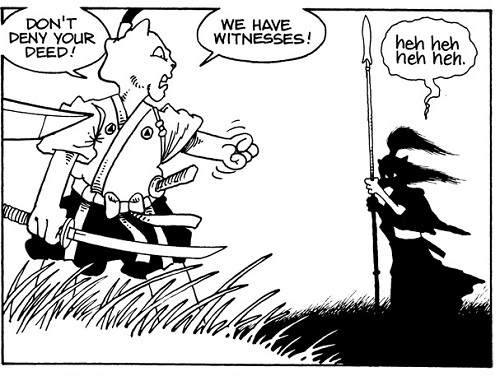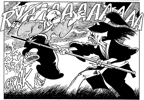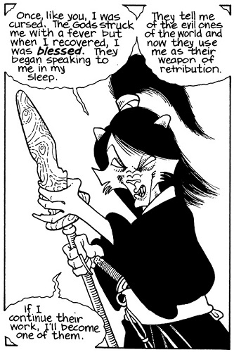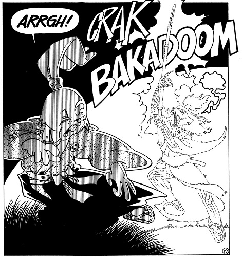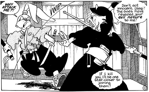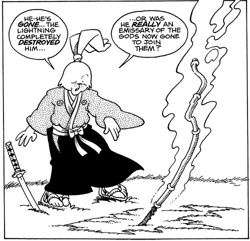 Adroit avec sa lance, le lapin parvint malgré tout à lui infliger une terrible blessure sur le flanc, qui aurait dû le tuer. Le loup y voyait un signe des dieux, à la fois pour continuer le combat mais aussi pour qu’il ne les déçoive pas. Il espérait qu’après avoir tué Usagi, il puisse être invité à leurs côtés. Il fut foudroyé sur place et le lapin n’en retrouva que sa lance.