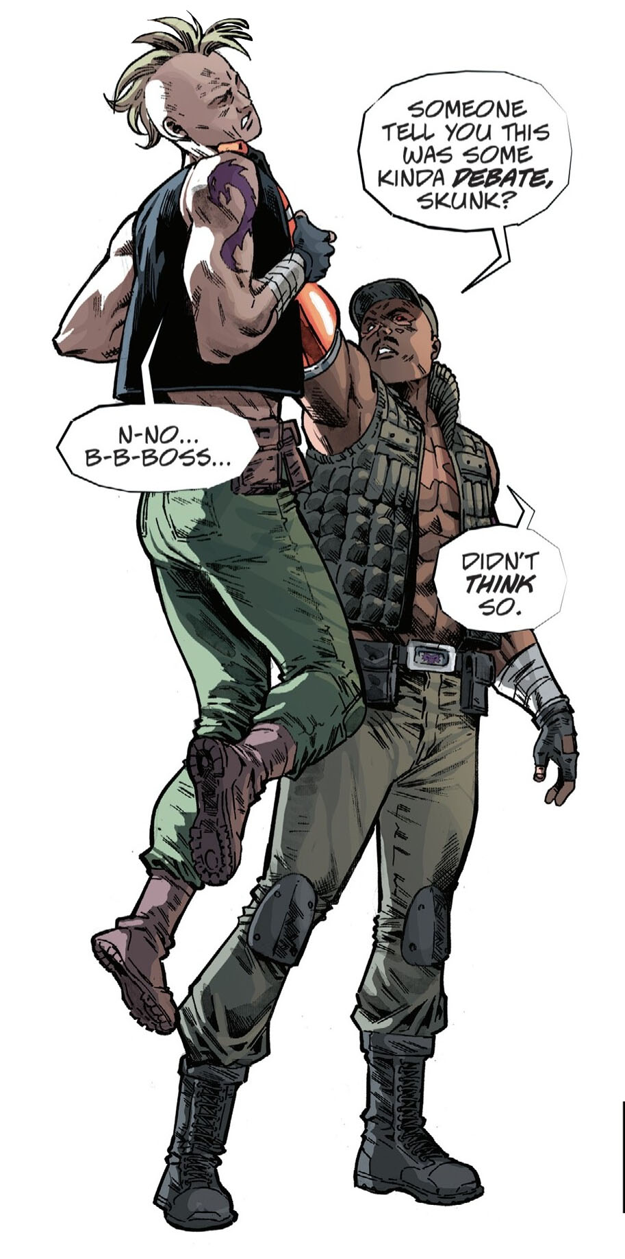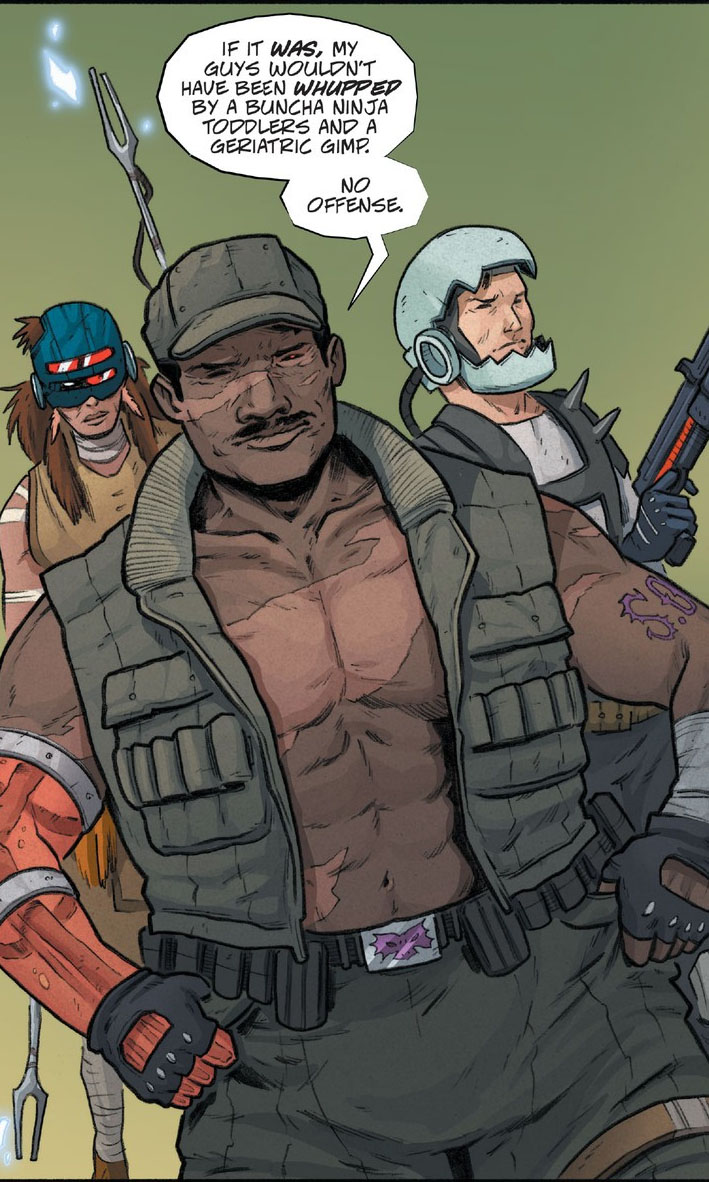 De retour dans le bureau de Carterton, Jigsaw n’accepta pas les remarques déplacées de son supérieur et claqua la porte, refusant de sacrifier d’autres de ses hommes pour les lubies de l’entrepreneur. Redevenu indépendant, l’homme décida de porter un coup fatal à la Résistance avec les derniers de ses soldats. L’un d’eux essaya de lui faire comprendre que ce n’était pas le moment, les Purple Dragons étant encore trop affaiblis par la mort des leurs. Il ne voulut rien entendre et prendre sa revanche sur les tortues (The last ronin II #4).