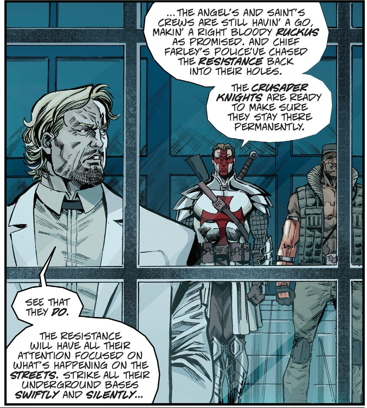 Plusieurs années après, Jigsaw s’allia à Arthur B. Carterton II, un puissant entrepreneur qui désirait assoir sa puissance sur New York à travers la manipulation de nombreuses factions dans le but de renverser la Résistance. Le chef des Purple dragons lança une attaque sur le repaire des tortues après avoir piraté les ordinateurs d’April. En parallèle, la Résistance fut attaquée par les Crusader Knights. La femme enclencha le protocole Teddy Bear, noyant tout le repaire et une partie des membres des Purple Dragons.