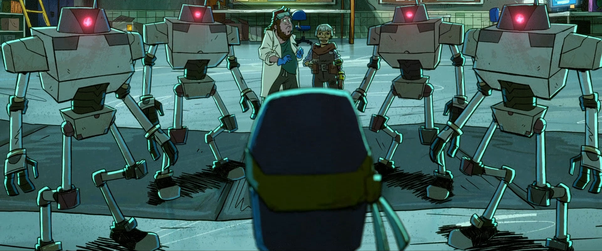 Une fois son plan préparé, elle partit pour un chantier naval de la ville pour tendre une embuscade aux premiers mutants. Elle envoya une alerte sur les téléphone, attirant ainsi les tortues, qui pensaient qu’une attaque était lancée. Arrivés sur place, les adolescents virent l’hologramme et activèrent le plan de Bishop. Les quatre Mechazoids se lancèrent sur les tortues. Les quatre frères réussirent à se défaire