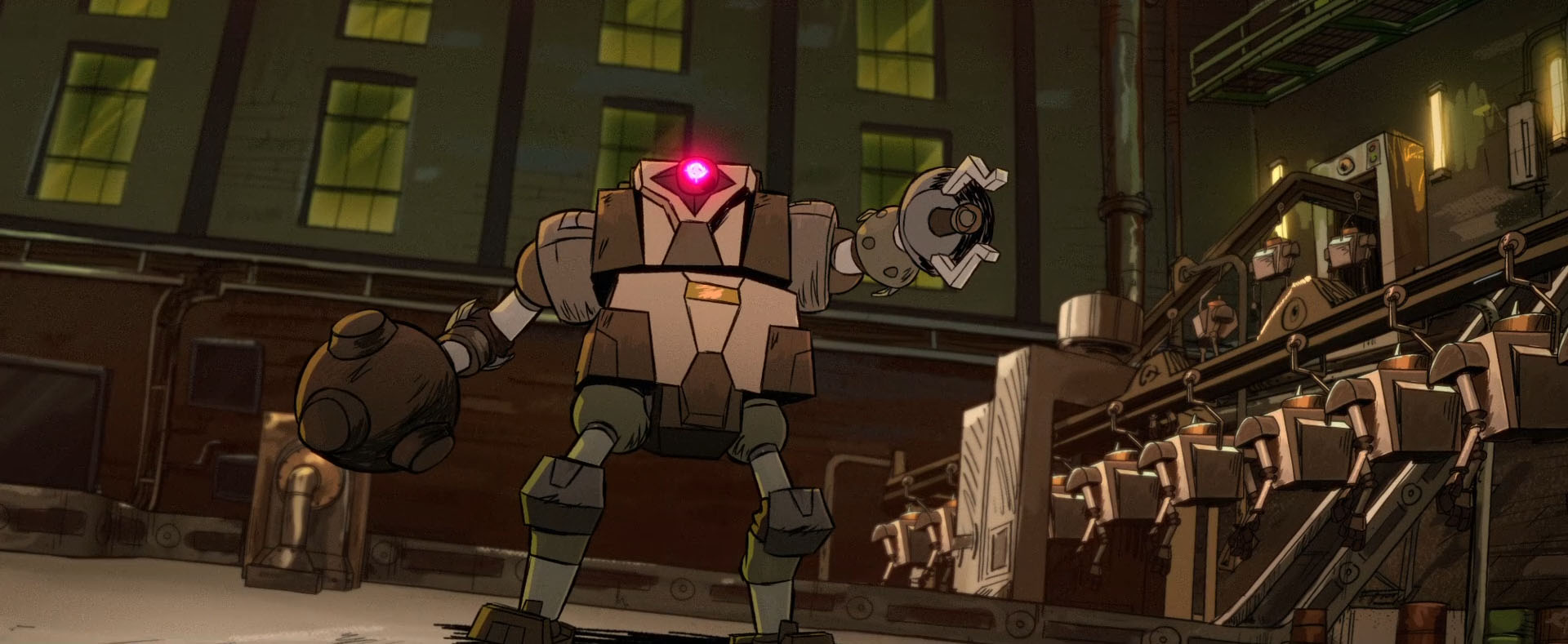 de leurs ennemis en faisant tomber un container sur les robots. Bishop n’avait pas prévu que ces containers renfermaient des feux d’artifices, ce qui provoqua une immense explosion. Sortant des décombres, Bishop partit pour sa salle de contrôle et se rendit compte que les tortues n’avaient pas été détruites. Les Mechazoids continuaient leur traque (Bishop passe à l’action, S1 E5).