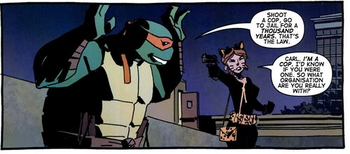 Un jour, Lewis se fit passer pour une voleuse qui devait infiltrer un groupe de criminels désirant dérober le diamant de Dresde. Elle prit Michelangelo pour l’informaticien Carl, qui devait désactiver le système de surveillance protégeant la pierre précieuse. La tortue fit profil bas un temps pour en apprendre plus sur les voleurs qui se méprenaient sur sa personne. Lorsque Michelangelo se décida à attaquer les criminels, Kara avait disparu. Tombant dans l’eau au pied du musée, il fut mis en joue à sa sortie par la détective en infiltration, qui comprit qu’il n’était pas un voleur. Alors qu’elle voulait lui expliquer ce qu’était le diamant, il disparut.