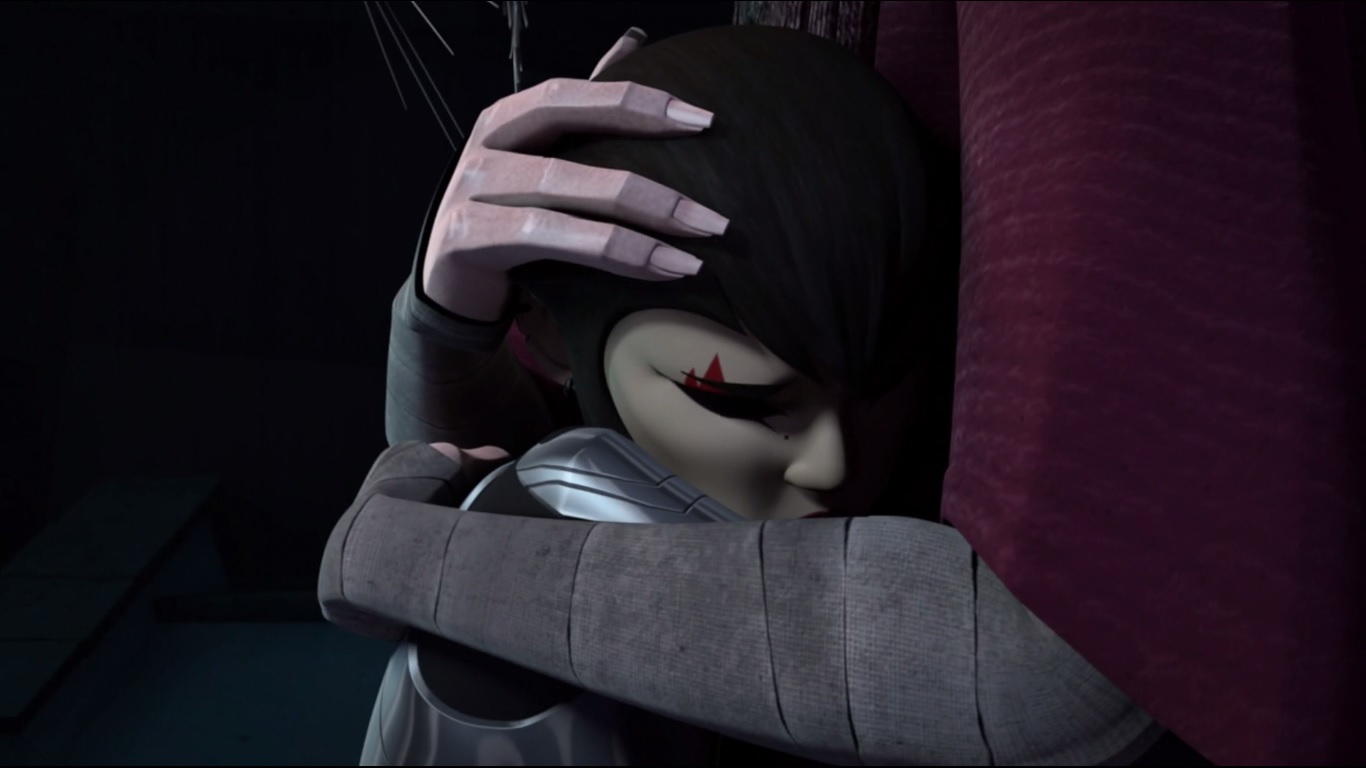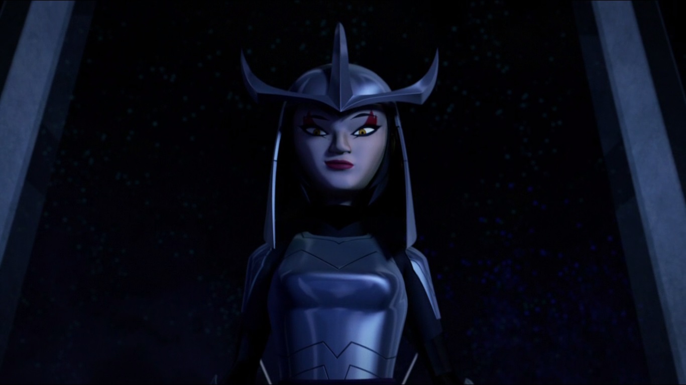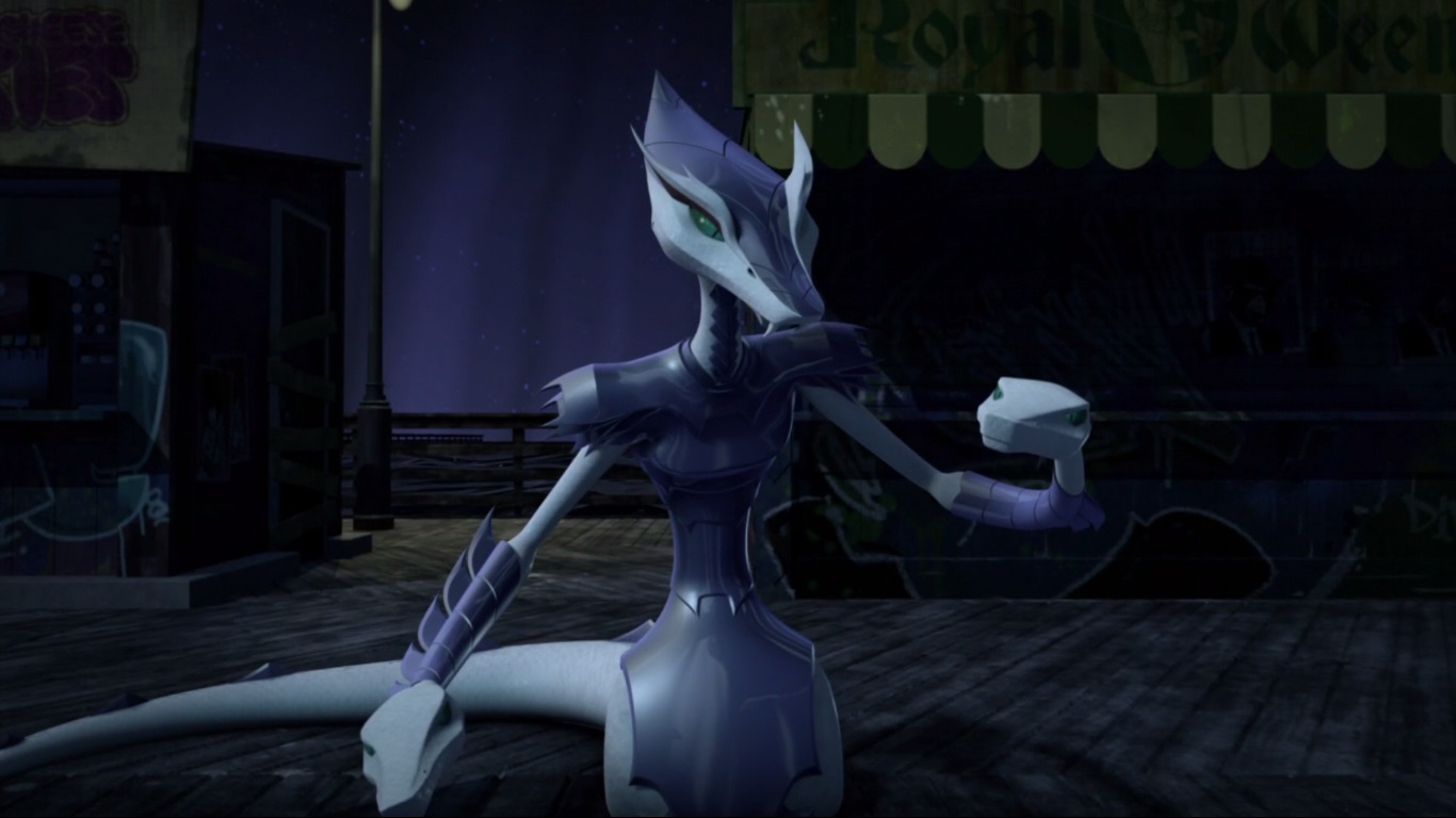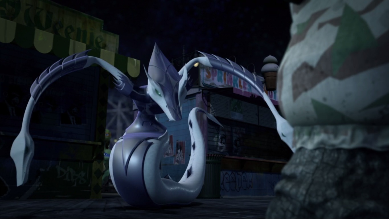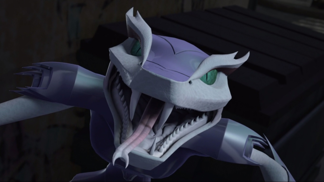 Vexée de ne pas être mieux considérée, elle décida de suivre les tortues pour en apprendre plus et les aida à se sortir d’une base secrète des extraterrestres. Elle ne repartit pas les mains vides, puisqu’elle avait emporté un fragment de l’exosquelette kraang. Un point qui intéressait Shredder et Baxter Stockman, ce dernier désirant améliorer les jambes robotiques qu’il avait mises au point pour Fishface (Le plan des kraangs, S1 E15).