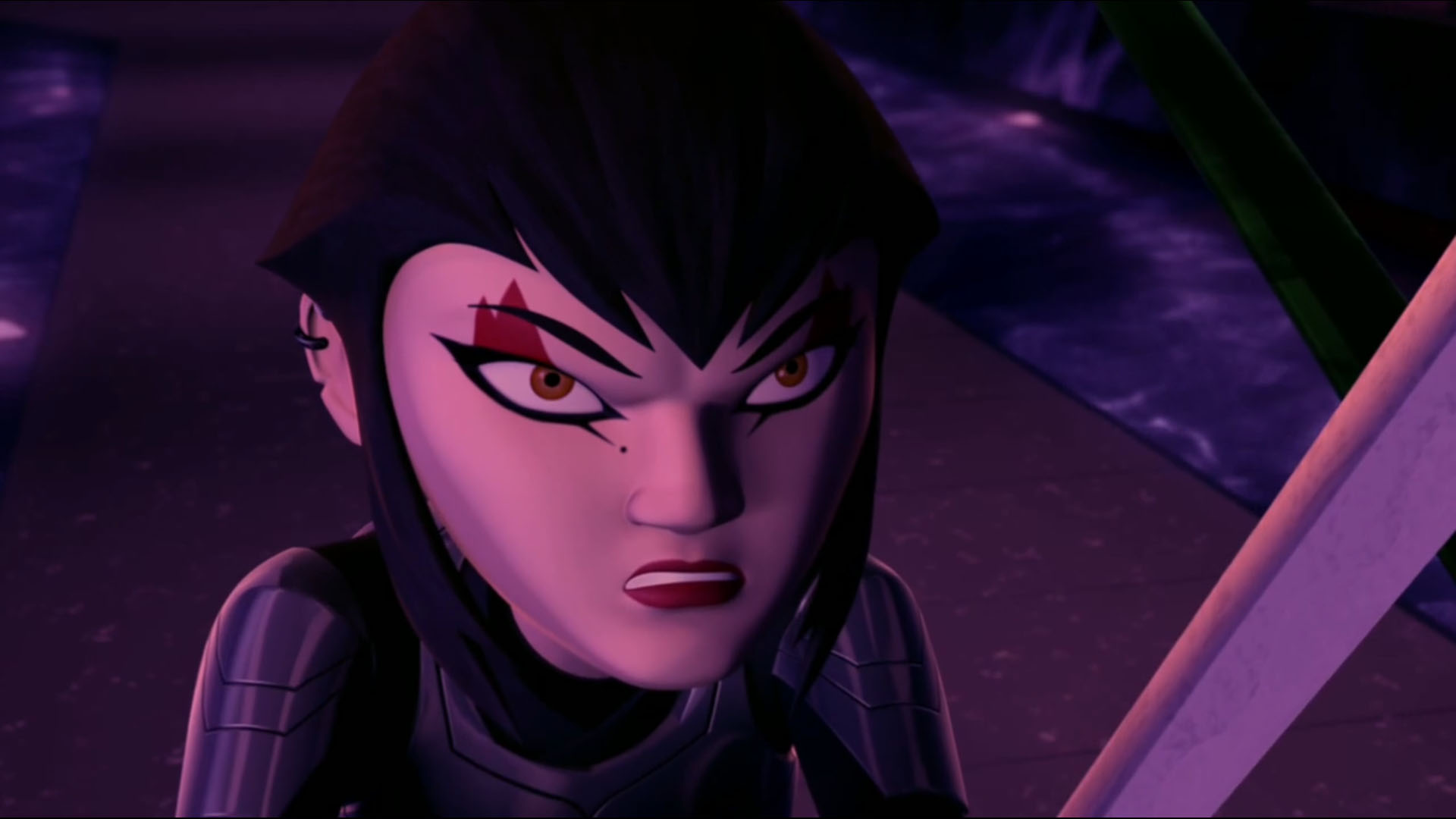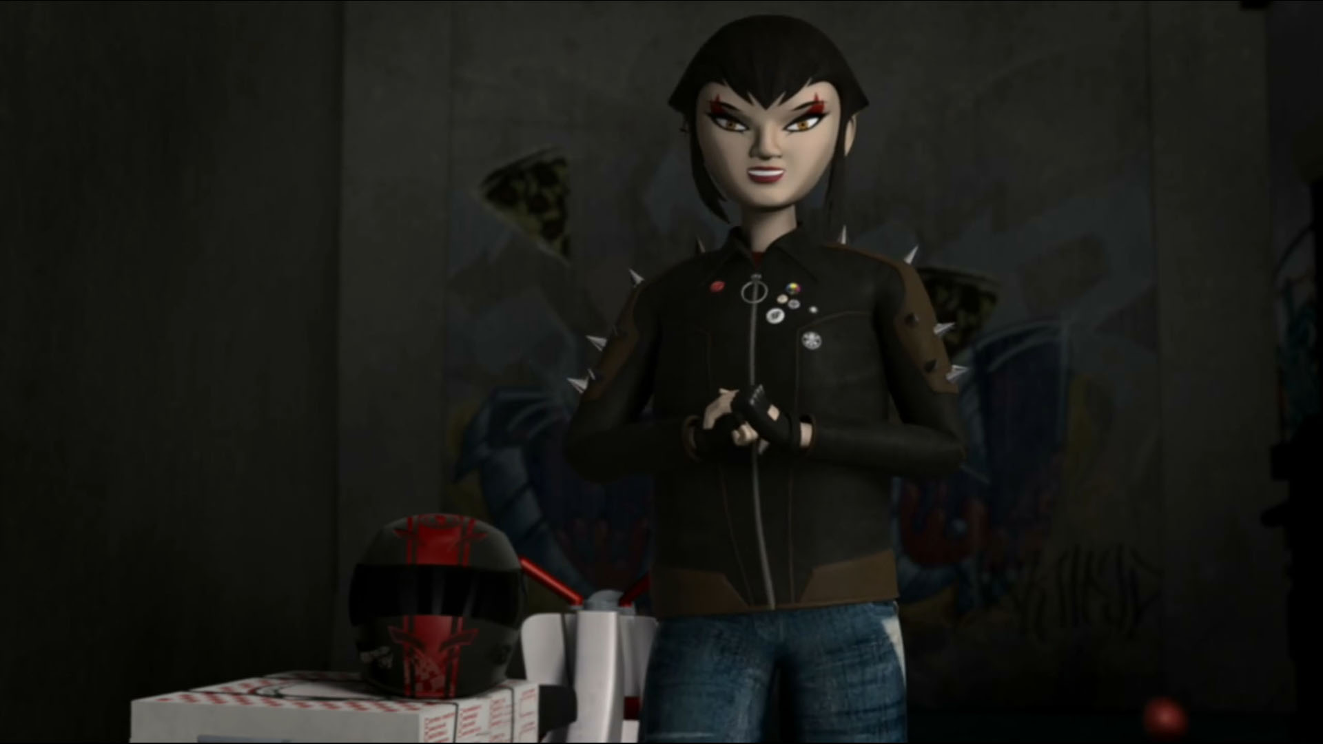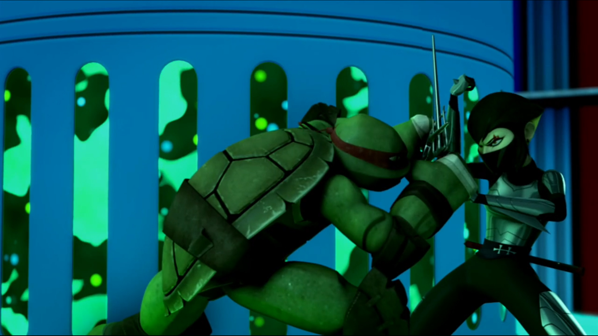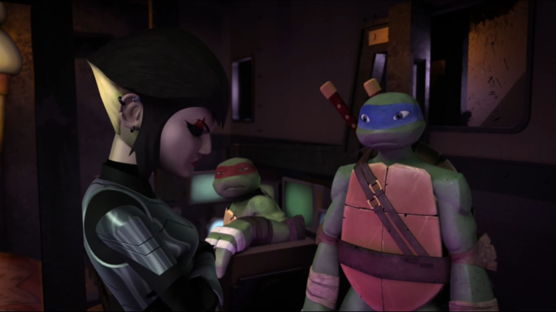 Vexée de ne pas être mieux considérée, elle décida de suivre les tortues pour en apprendre plus et les aida à se sortir d’une base secrète des extraterrestres. Elle ne repartit pas les mains vides, puisqu’elle avait emporté un fragment de l’exosquelette kraang. Un point qui intéressait Shredder et Baxter Stockman, ce dernier désirant améliorer les jambes robotiques qu’il avait mises au point pour Fishface (Le plan des kraangs, S1 E15).