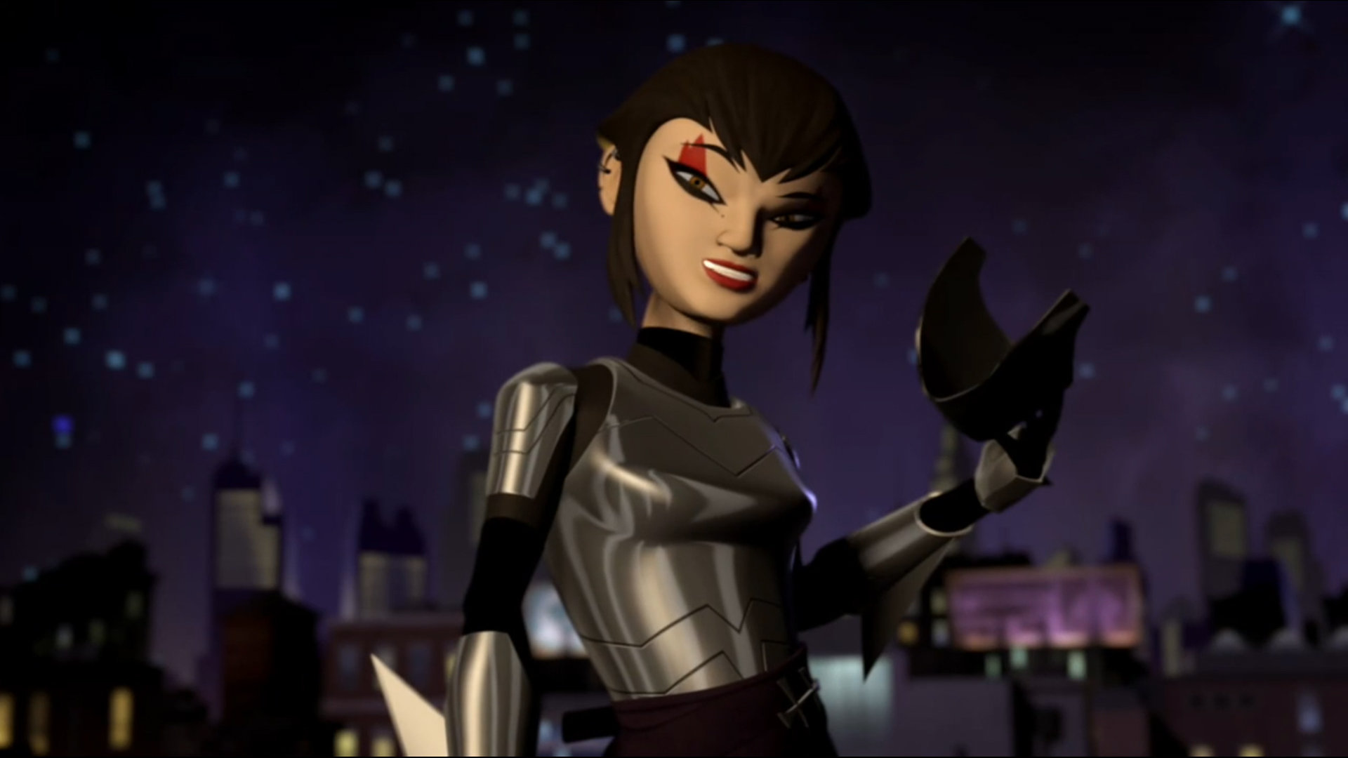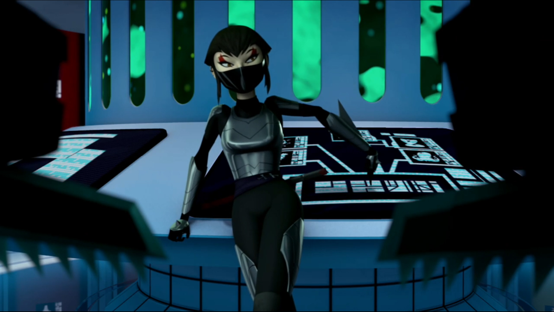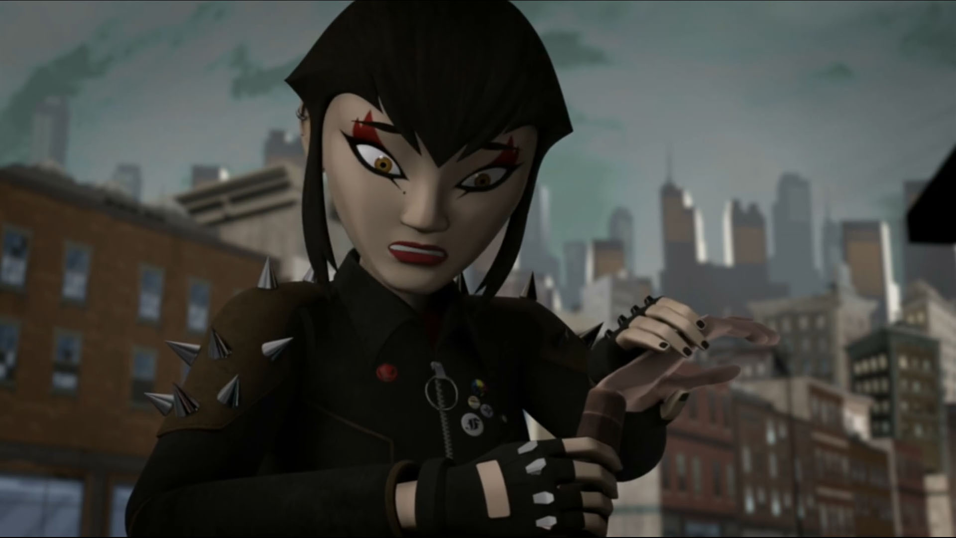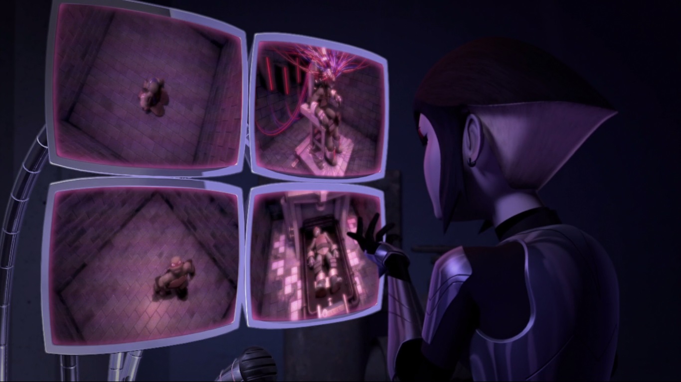 Vexée de ne pas être mieux considérée, elle décida de suivre les tortues pour en apprendre plus et les aida à se sortir d’une base secrète des extraterrestres. Elle ne repartit pas les mains vides, puisqu’elle avait emporté un fragment de l’exosquelette kraang. Un point qui intéressait Shredder et Baxter Stockman, ce dernier désirant améliorer les jambes robotiques qu’il avait mises au point pour Fishface (Le plan des kraangs, S1 E15).