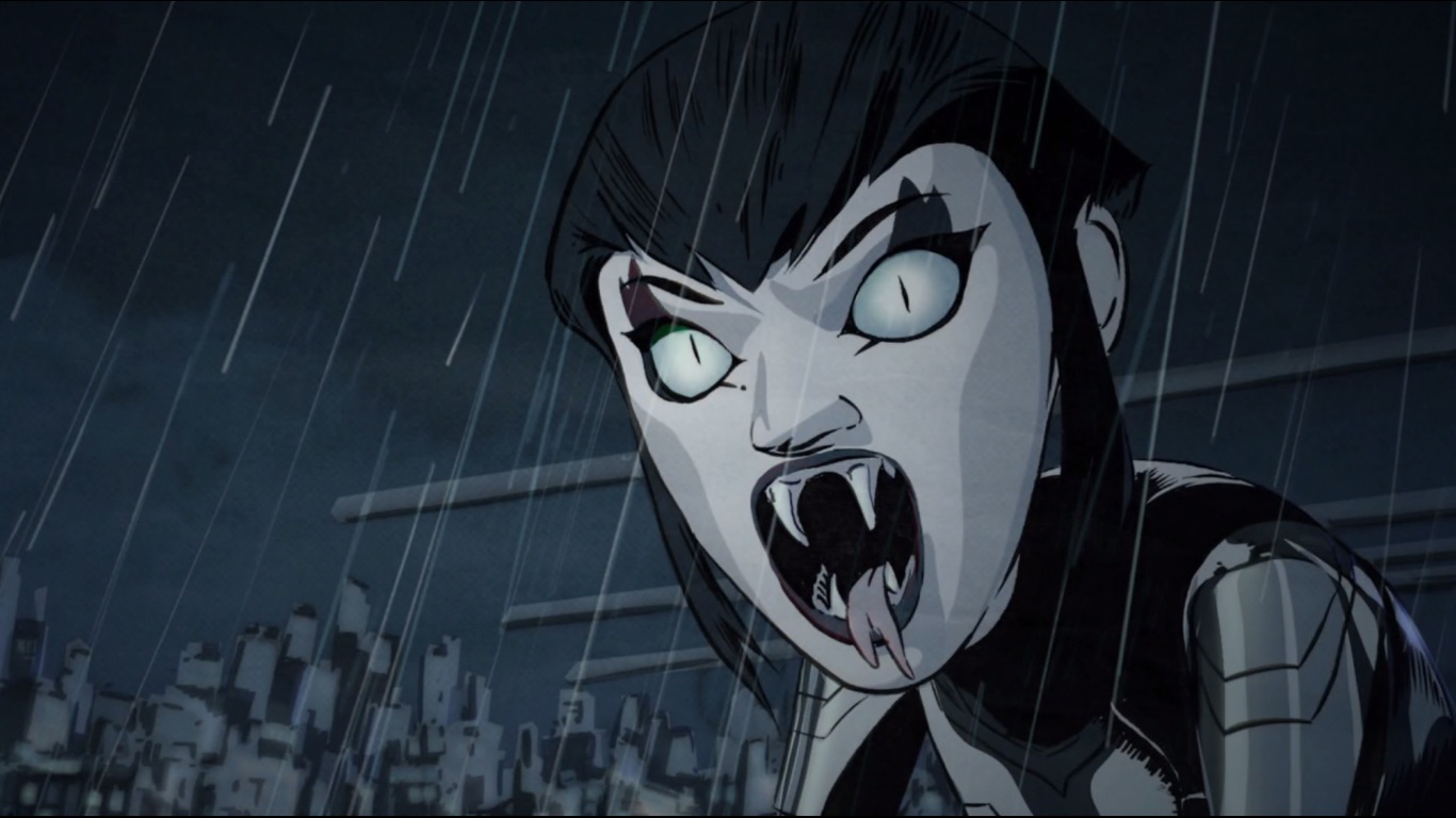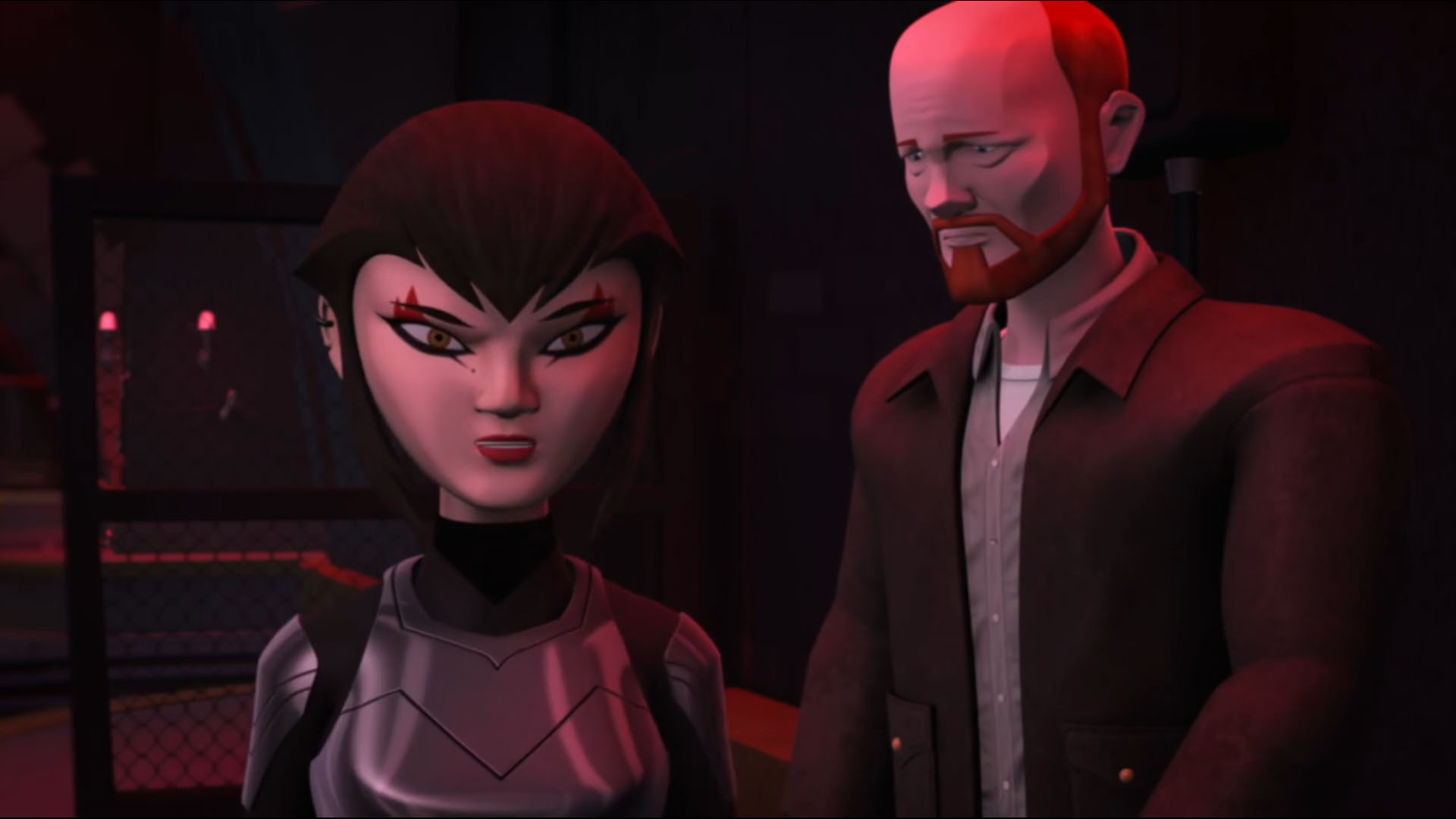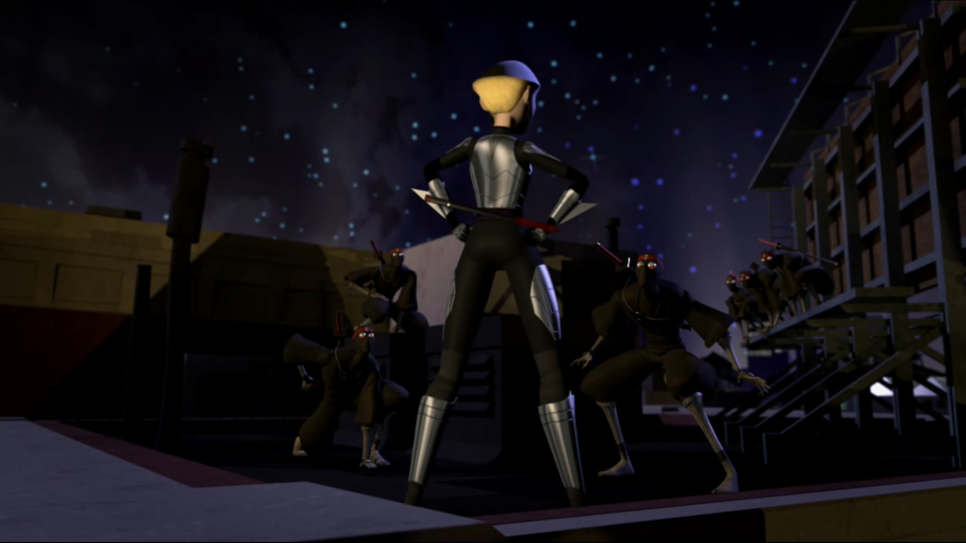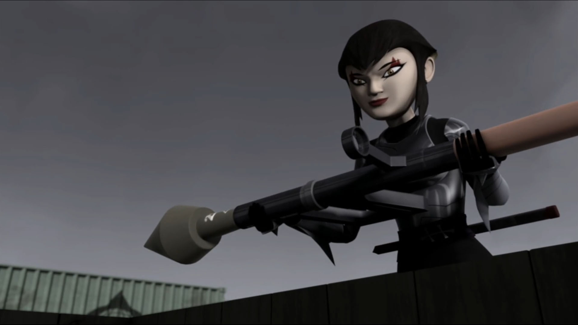 Vexée de ne pas être mieux considérée, elle décida de suivre les tortues pour en apprendre plus et les aida à se sortir d’une base secrète des extraterrestres. Elle ne repartit pas les mains vides, puisqu’elle avait emporté un fragment de l’exosquelette kraang. Un point qui intéressait Shredder et Baxter Stockman, ce dernier désirant améliorer les jambes robotiques qu’il avait mises au point pour Fishface (Le plan des kraangs, S1 E15).