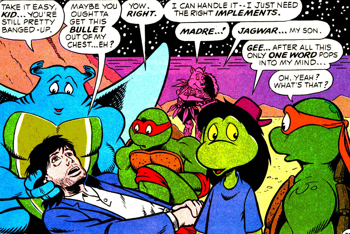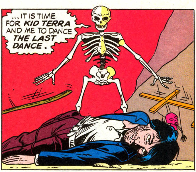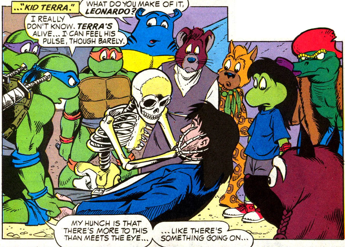 Kid Terra se fit tirer dessus par Null, décidé à se venger pour sa trahison. Son corps inerte fut ensuite pris par Death, qui essaya d’en extraire sa vie. Il fut sauvé par Juntarra, qui frappa le squelette de sa propre faux. La vie lui fut rendue. Les femmes purent veiller sur lui une fois le combat terminé (TMNT A. #39).