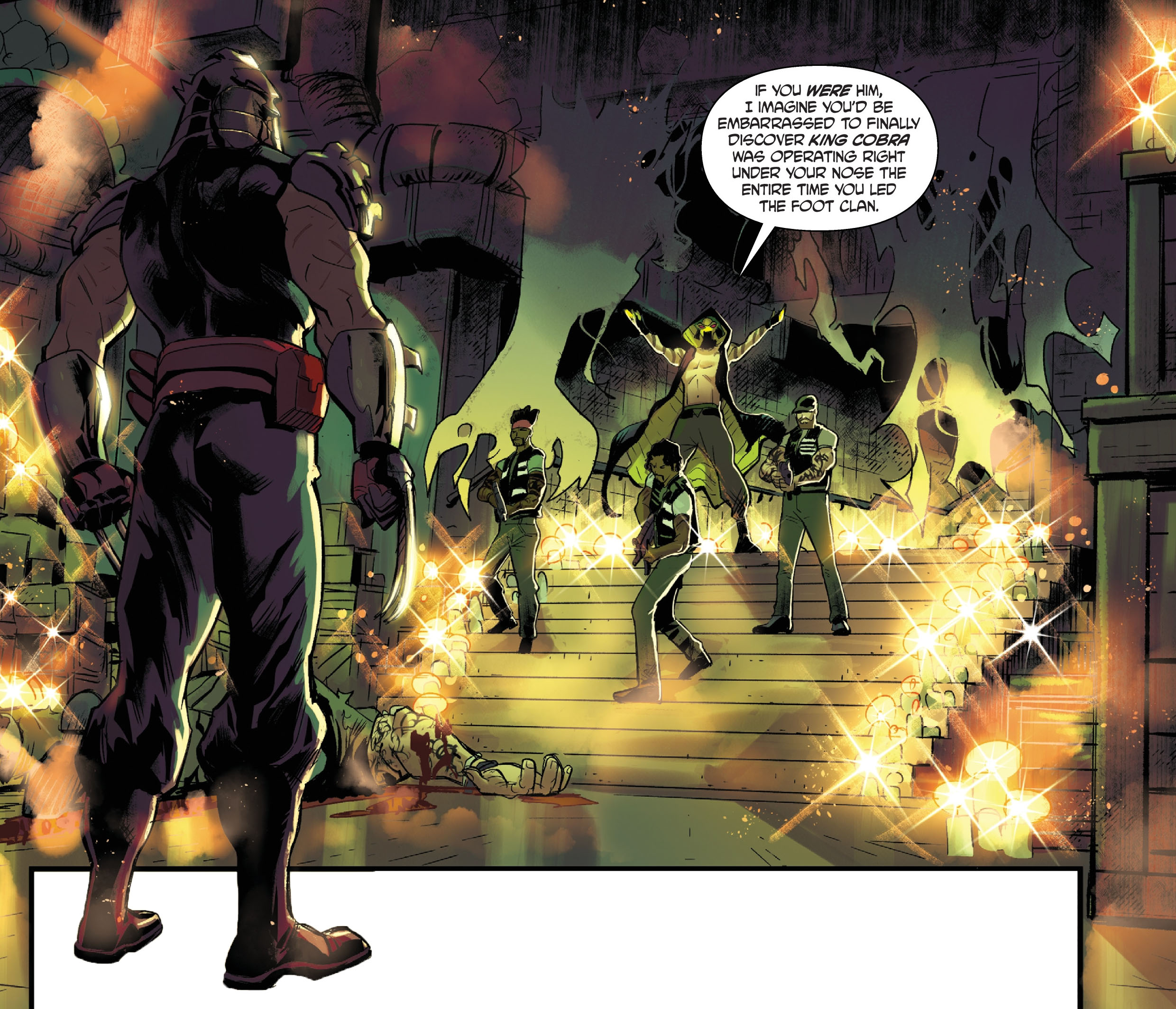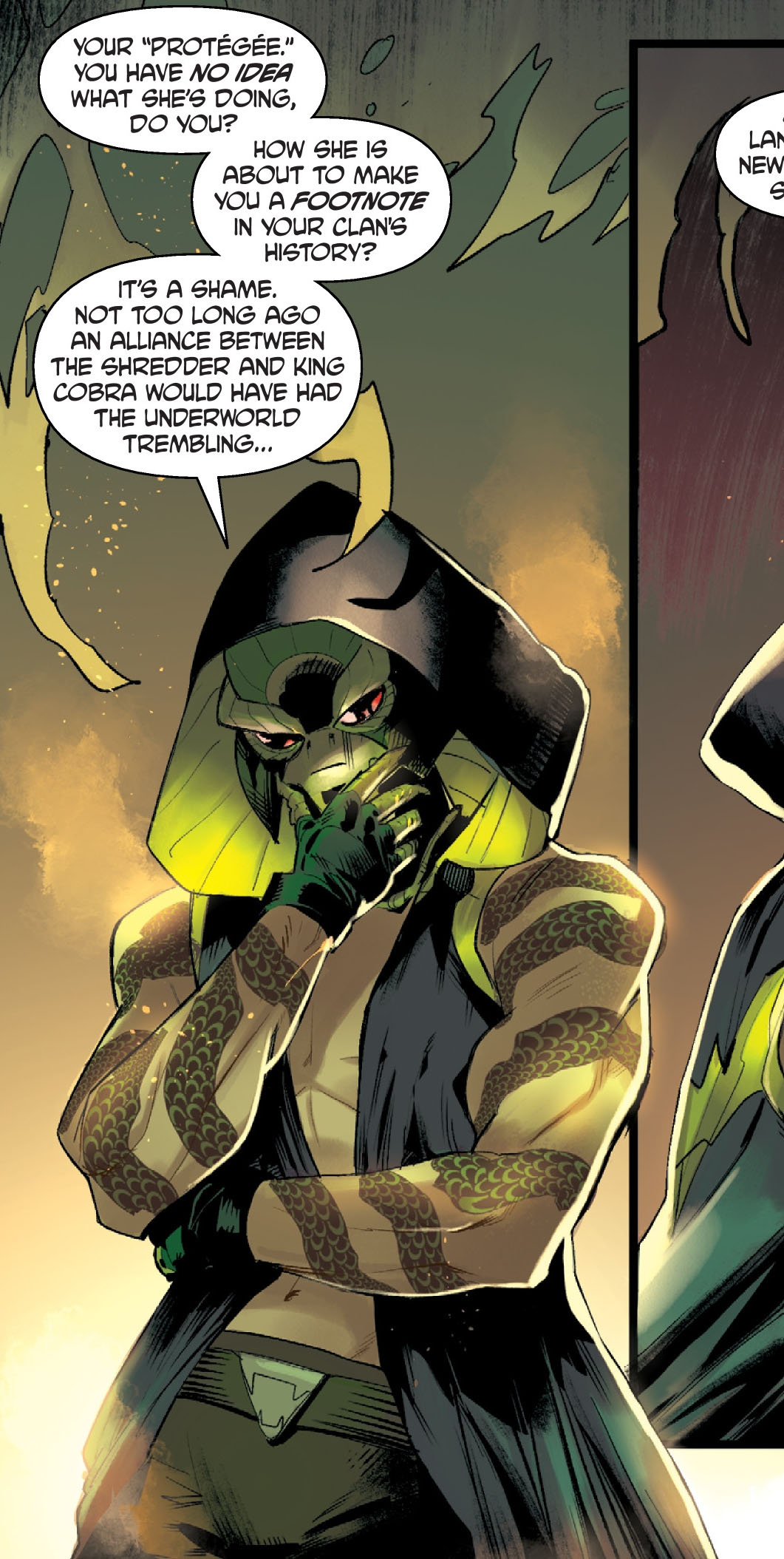 Engagé par Dark Water pour retrouver la Mourner, Shredder se lança à la recherche du King Cobra afin d’obtenir des informations. Il savait pertinemment qu’il existait, mais ne s’y était jamais trop intéressé pour ne pas éveiller les soupçons. Il comptait se servir de lui le moment venu.  Entrant dans son repaire, il élimina ses gardes et se jeta sur le roi. De ses griffes, il lui ôta son masque et découvrit qu’il n’avait rien de monstrueux. Le King Cobra n’était qu’un humain ordinaire, qui avait fait fructifier son empire à travers le mystère autour de sa personnalité.