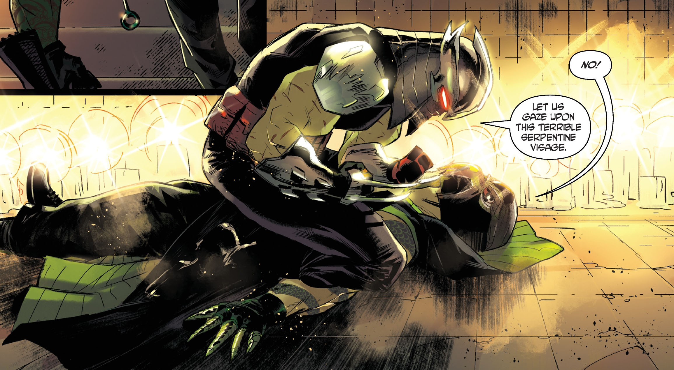 Après cela, King Cobra guetta le retour de Shredder, à bord d’un jet de Darkwater. Lorsqu’il s’approcha de l’édifice de l’organisation, il fut abattu en plein vol. Shredder sortit des décombres qui s’étaient abîmés dans l’eau à proximité du port et s’attaqua à son agresseur. Ce dernier se vantait de vouloir lui arracha la peau du visage et la mettre sur le sien en guise de vengeance pour ce qu’il lui avait fait précédemment. Il lui ôta le visage à sa place et la jeta au visage d’un policier qui cherchait à l’appréhender, peu après, alors qu’il se rendait dans les locaux de Darkwater pour affronter la Mourner (Shredder #5).