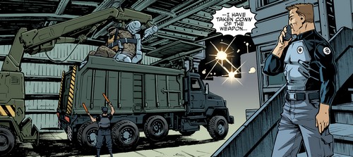 Au même moment, le sergent Winter arriva à bord d’un hélicoptère pour ramener son supérieur, craignant des représailles de la part de la mairie de New York. Lindsey Baker fut emmenée dans les laboratoires de l’Earth Protection Force (TMNT : Alpha – Monster Island).