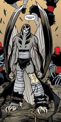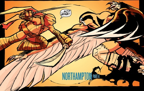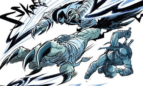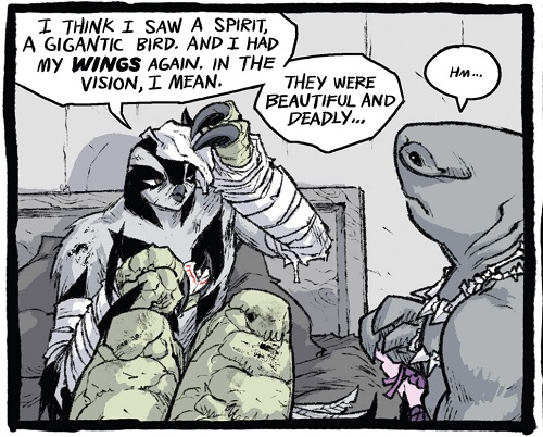 Malgré cette aventure, le faucon continuait de broyer du noir, se sentant toujours aussi inutile sans la capacité de voler. Soudain, l’arbre sur lequel elle se trouvait fut frappé par la foudre. Jetée au sol, le corps fumant, elle entendit une voix dans sa tête. Elle se vit avec des ailes. Il s’agissait d’une manifestation de son talisman. Retrouvant Bludgeon, celui-ci voulut prendre soin d’elle mais très vite les esprits s’échauffèrent lorsque le requin vit qu’elle n’acceptait toujours pas sa condition. Lui sautant dessus elle ne vit pas derrière elle Ocho qui se mit à la provoquer volontairement. Après avoir essuyé quelques coups du yokai, elle fut jetée d’une falaise non loin. Elle entendit de nouveau une voix dans sa tête. Combattant spirituellement le faucon qui lui était apparu, elle le vainquit et se nourrit de l’aura du talisman pour se créer de nouvelles ailes. Elle comprit qu’Ocho l’avait provoquée pour qu’elle use de son pouvoir. Maintenant qu’elle avait recouvré la capacité de voler, elle n’avait plus qu’une idée : se venger de Leonardo (TMNT Universe : Prey).