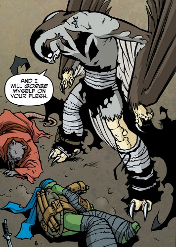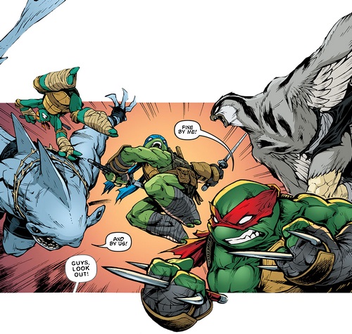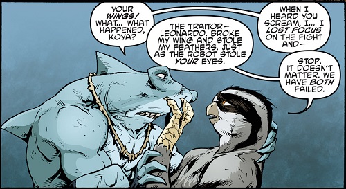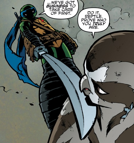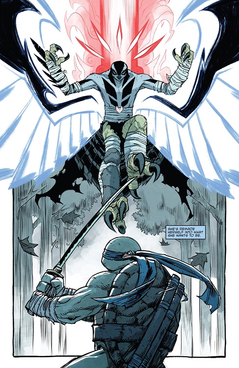 Se remettant de ses problèmes, Leonardo arriva à temps pour aider ses frères dans le combat. Ce fut Michelangelo qui renversa le rapace mutant avec une moto. Leonardo laissa la vie sauve à Koya, espérant ainsi lui montrer l’exemple. Le faucon s’en alla avec ses ninjas, promettant sa revanche. Ils disparurent dans les bois (TMNT (Vol. 5) #31).