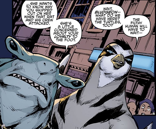 Karai et Koya les retrouvèrent et leur demandèrent de se joindre à le cause. Mais ni Bludgeon ni Venus n’acceptaient. Le requin en avait assez de la violence du clan, et malgré la déception de Koya, il préféra garder ses distances avec Karai (The Armageddon Game – The alliance #4).