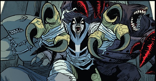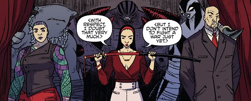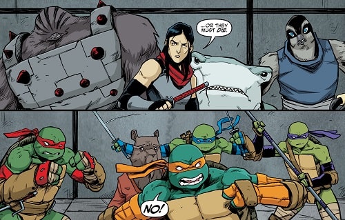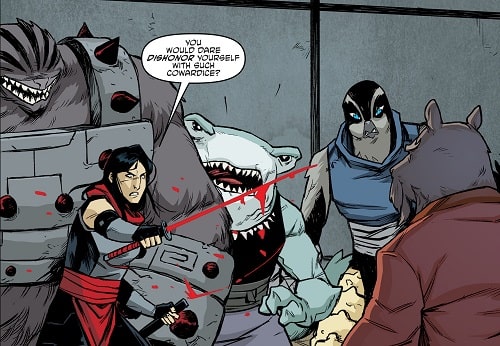 Sa fidélité envers le chef du Foot Clan était très forte. L’accompagnant avec le requin sur le champ de bataille de Burnow Island (TMNT (Vol. 5) #42), ils combattirent les troupes du général Krang. Lorsque le Technodrome initia sa phase de terraformation de l’île, les rangs du Foot Clan furent presque totalement décimés. Elle crut que Shredder était mort, terrassé par l’utrom et l’oxygène qui venait à manquer. Elle partit avec Bludgeon pour New York, assumant leur échec et le déshonneur qui en découlait (TMNT (Vol. 5) #44).