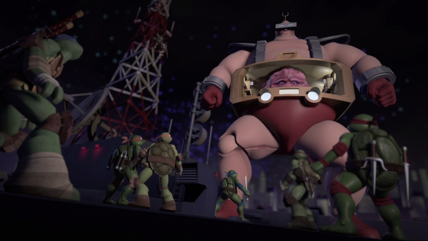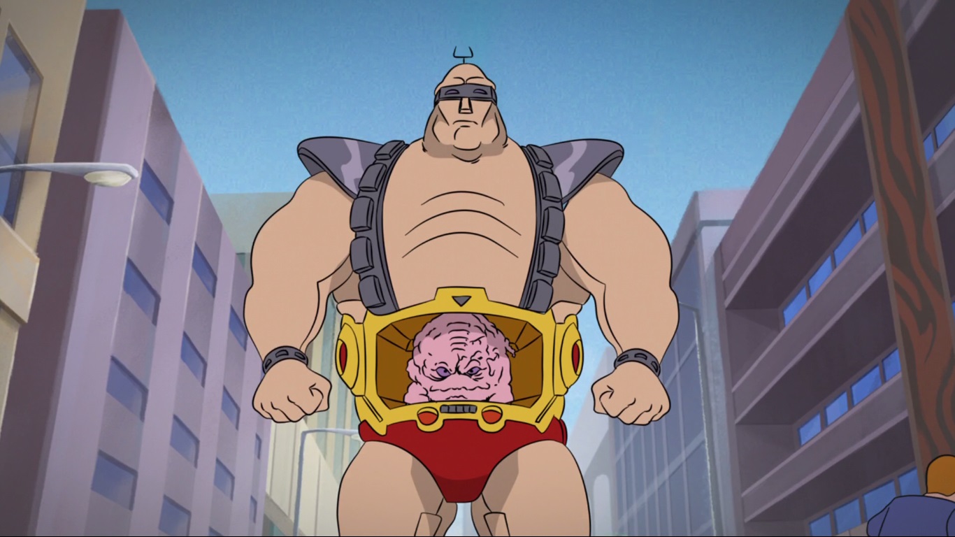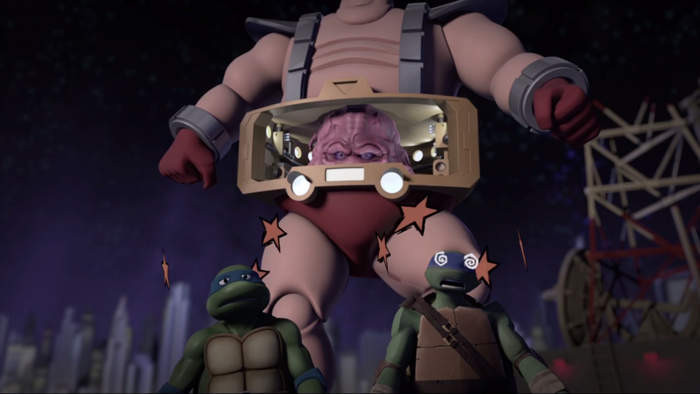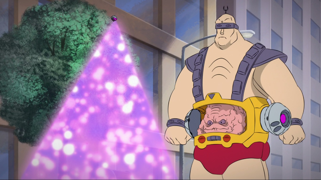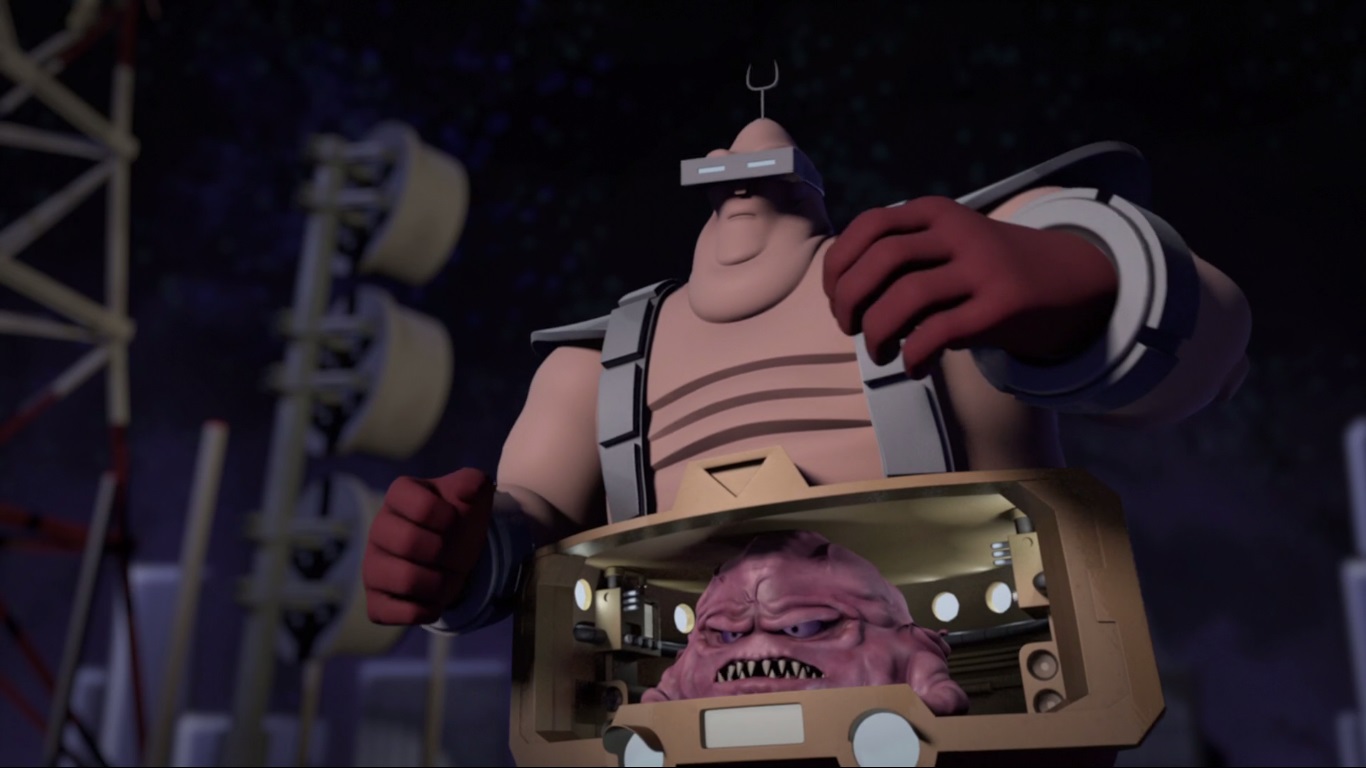 - Les deux autres fois furent dans des épisodes commémoratifs, à savoir le téléfilm Turtles forever, lorsque Krang essaie de vaincre Ch’Rell dans l’univers du comic originel et dans Les tortues transdimensionelles (S4 E10 de la série TV de 2012) lorsque Krang essaie de poser une bombe sur la tour de Channel 6. De simples clins d’œil à la saison la plus connue de la série.