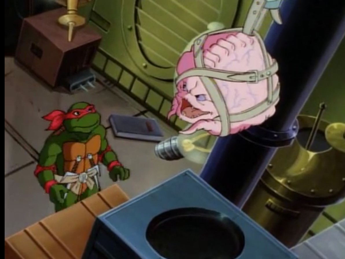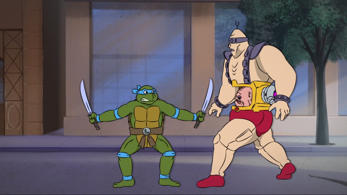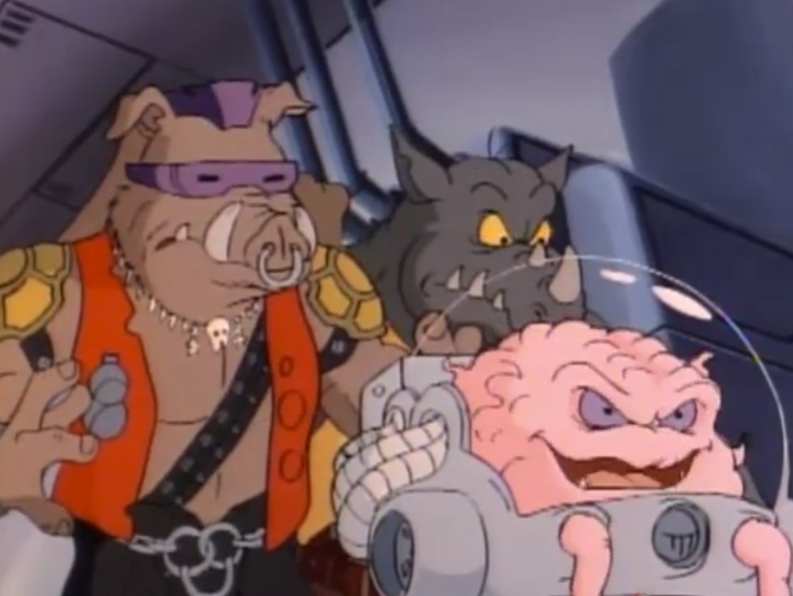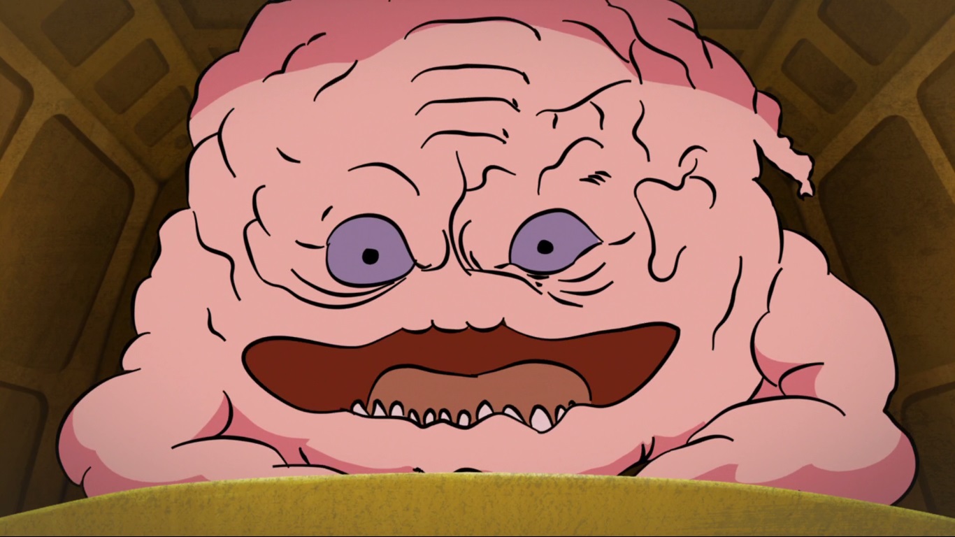 - Les deux autres fois furent dans des épisodes commémoratifs, à savoir le téléfilm Turtles forever, lorsque Krang essaie de vaincre Ch’Rell dans l’univers du comic originel et dans Les tortues transdimensionelles (S4 E10 de la série TV de 2012) lorsque Krang essaie de poser une bombe sur la tour de Channel 6. De simples clins d’œil à la saison la plus connue de la série.