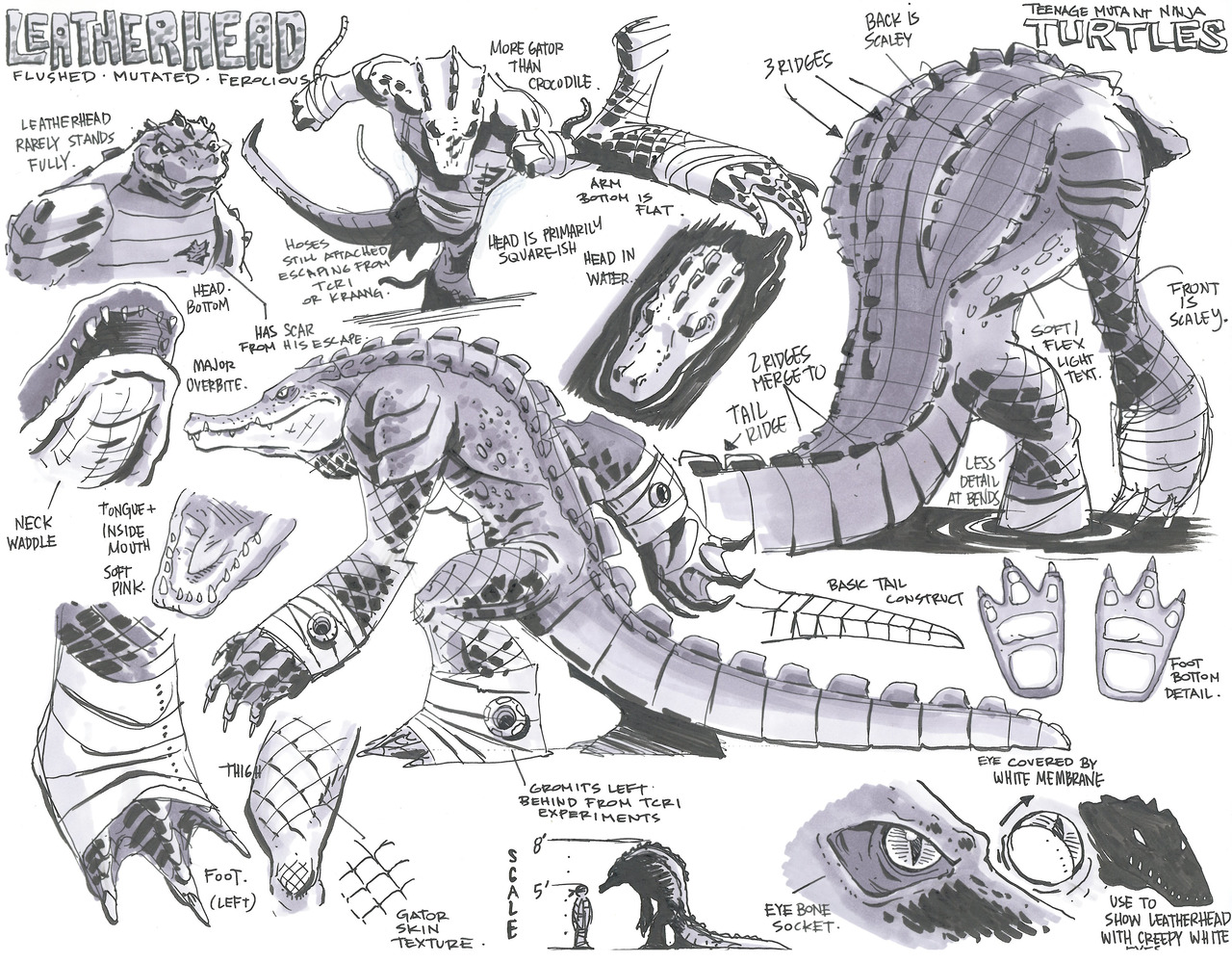 - Le personnage de Leatherhead a été écrit principalement par Russ Carney et Ron Corcillo. C’est ce second qui lui a donné cet aspect torturé, en s’inspirant de son chien de compagnie, qu’il avait secouru après une agression. L’auteur se sentait un petit peu comme Michelangelo à son égard. Son chien avait peut-être servi pour des combats d’argent (source).