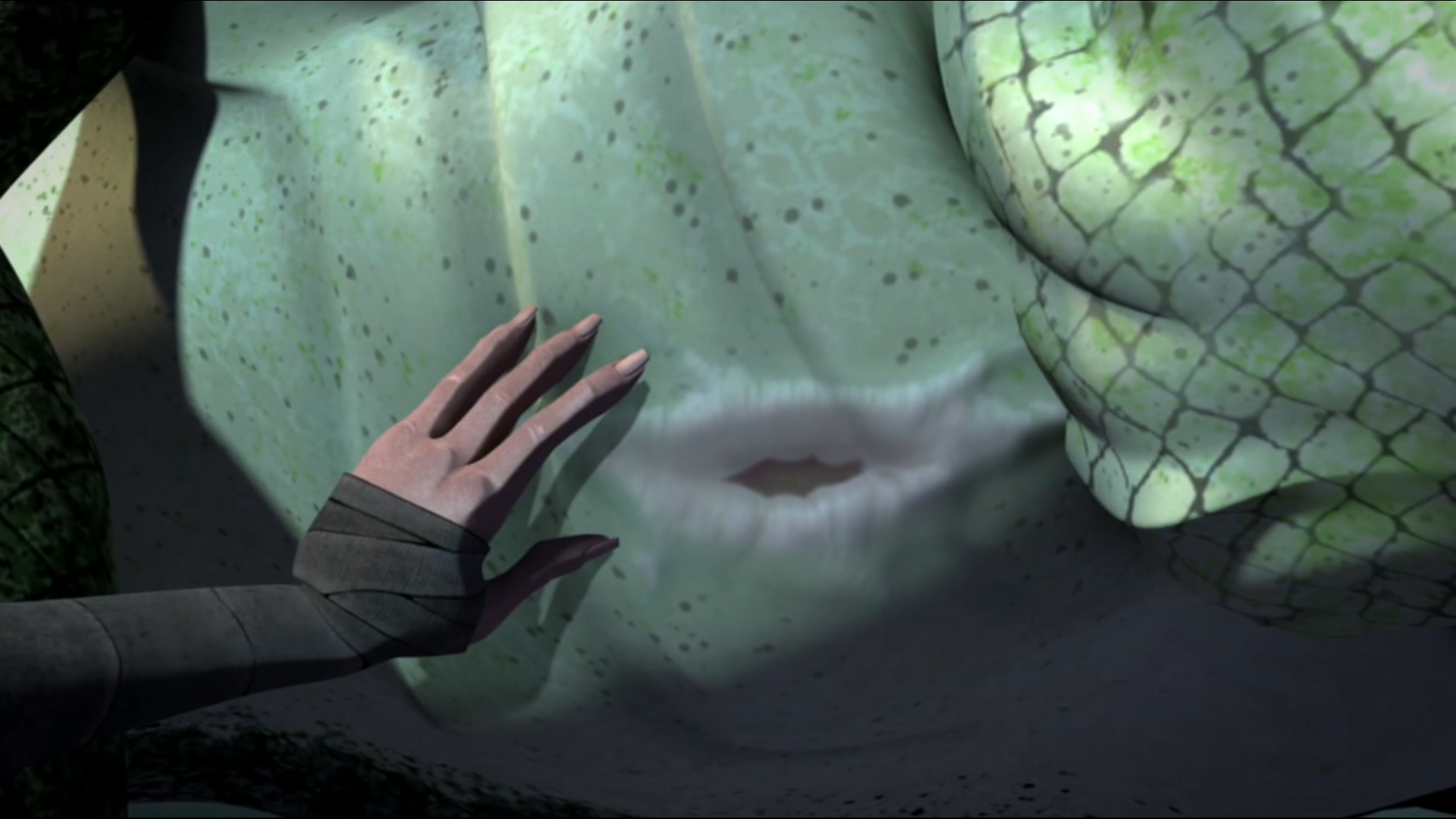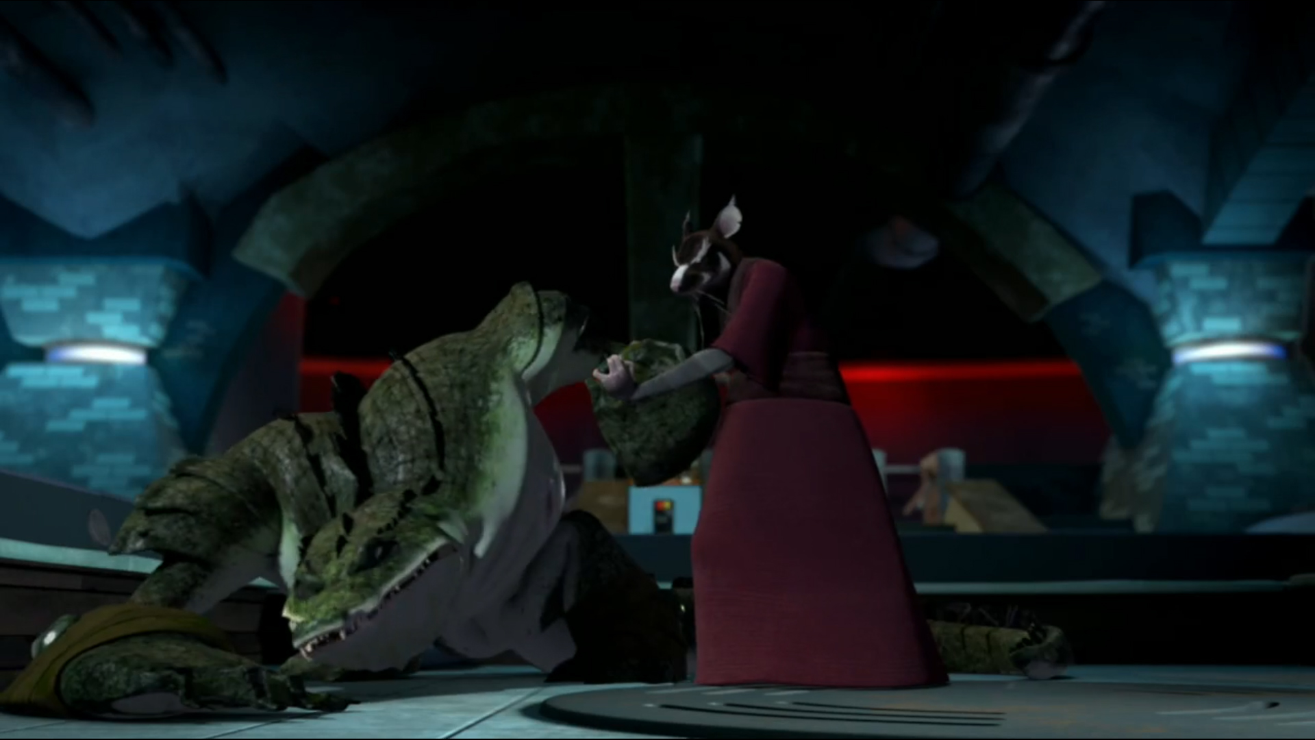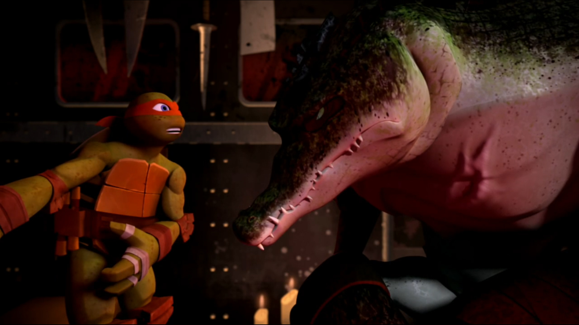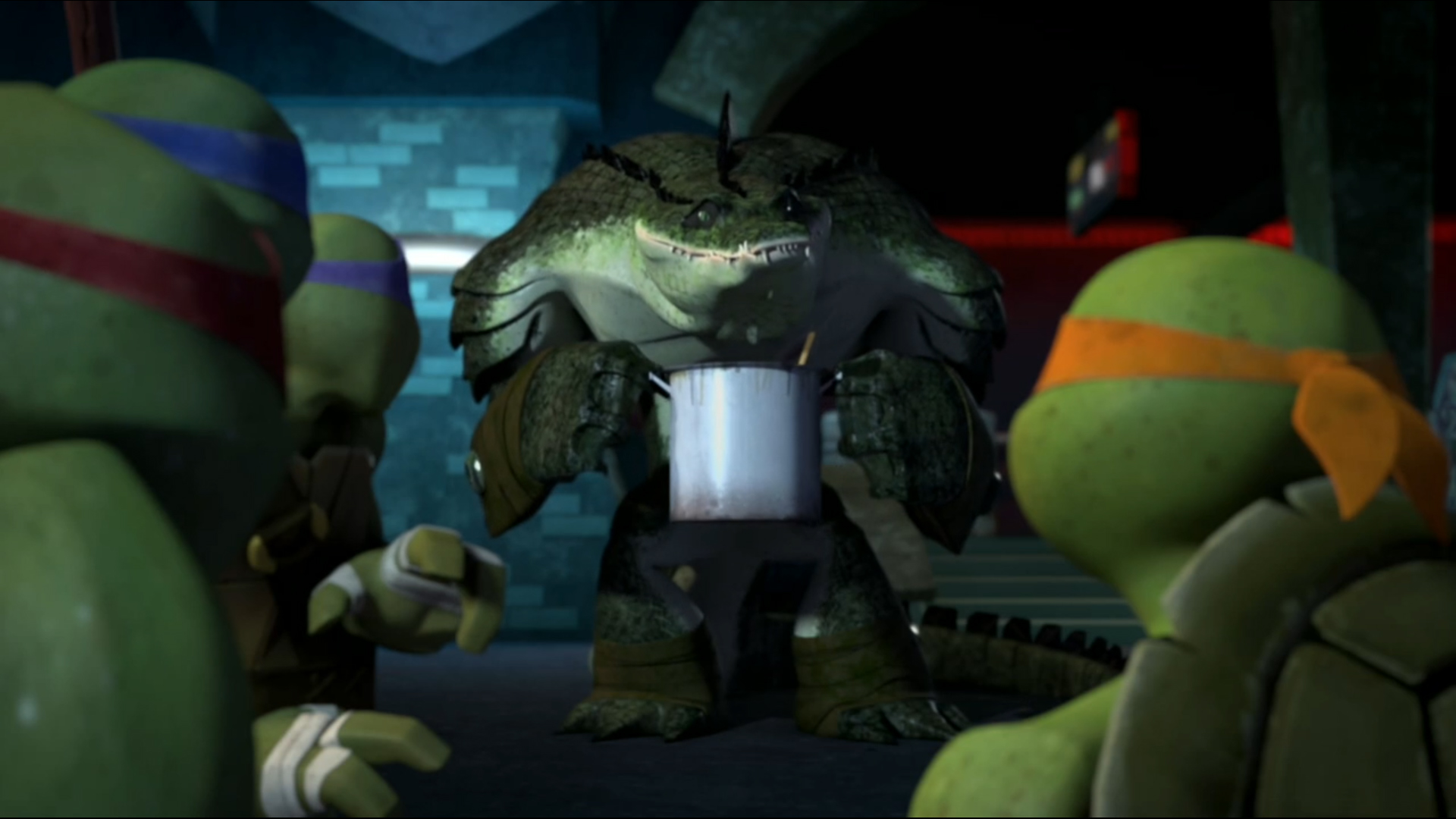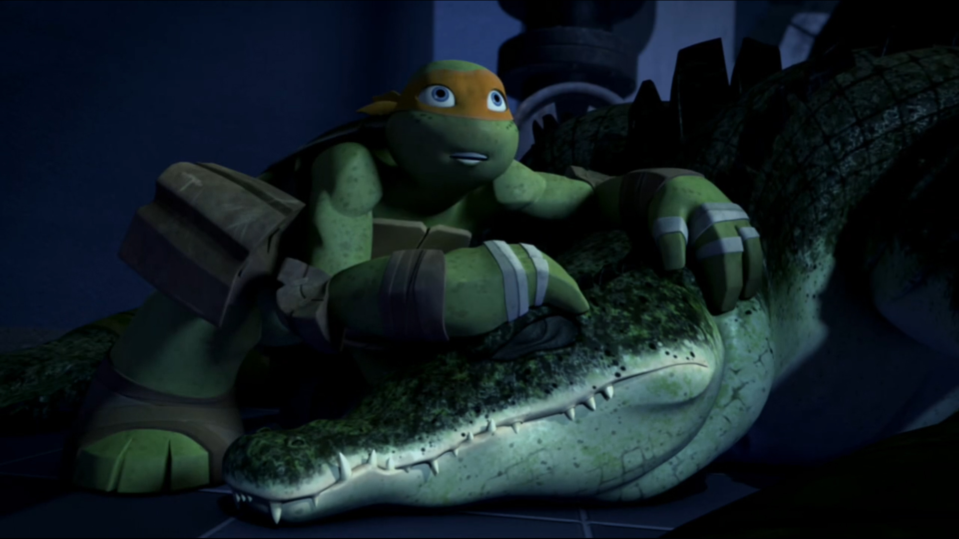 Les kraangs maîtrisés, Leatherhead était étendu sur le sol, inconscient. Michelangelo voulait à tous prix le ramener au repaire pour le soigner. Finalement, les tortues l’aidèrent et à leur grande surprise, Splinter se montra favorable à accueillir cet invité chez eux.