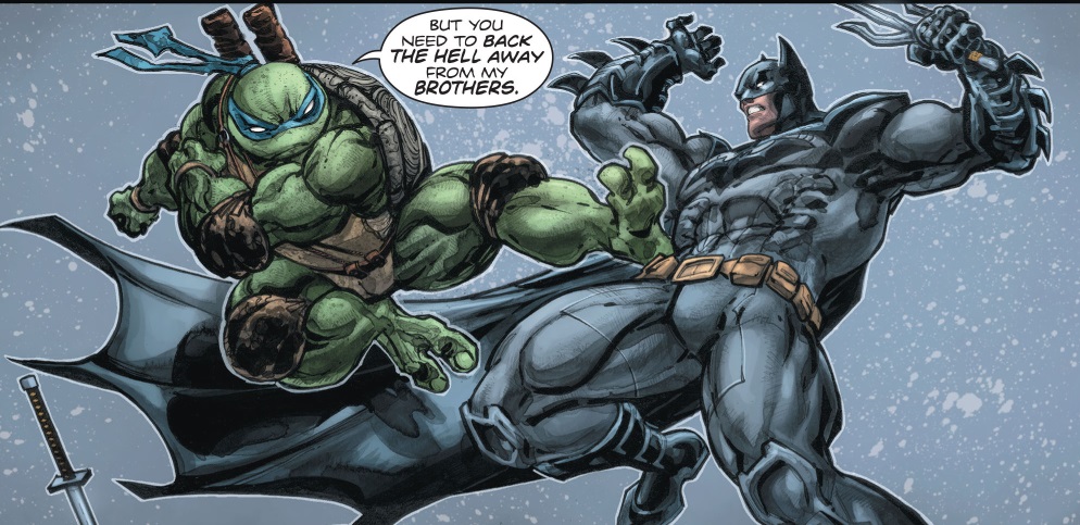 Leonardo était le plus discipliné des quatre frères. Grand amateur d’arts martiaux, il était le chef de la fratrie. Lorsqu’il rencontra Batman pour la première fois, il était le dernier encore debout pour lui livrer bataille. Ses frères étant déjà vaincus. S’il ne fit pas long feu contre l’expert du combat qu’était le chevalier noir (Batman / TMNT, part. 2), il découvrit en Batman un grand allié pour lutter contre Shredder (Batman / TMNT, part. 3) et espérer revenir dans sa dimension (Batman / TMNT, part. 6).
