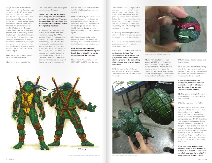 Le 7 juillet 2015, le fabricant de Hong Kong ThreeZero annonça une nouvelle gamme de figurines totalement inédite. Elle s’appuyait sur un design original du cocréateur des TMNT Kevin Eastman. C’est à l’occasion de la San Diego Comic Con, la semaine suivante, que les prototypes des quatre tortues ont pu être présentés au public. En janvier 2016, l’artiste se confiait un petit peu plus sur la genèse du projet en partenariat avec ThreeZero (en savoir plus).