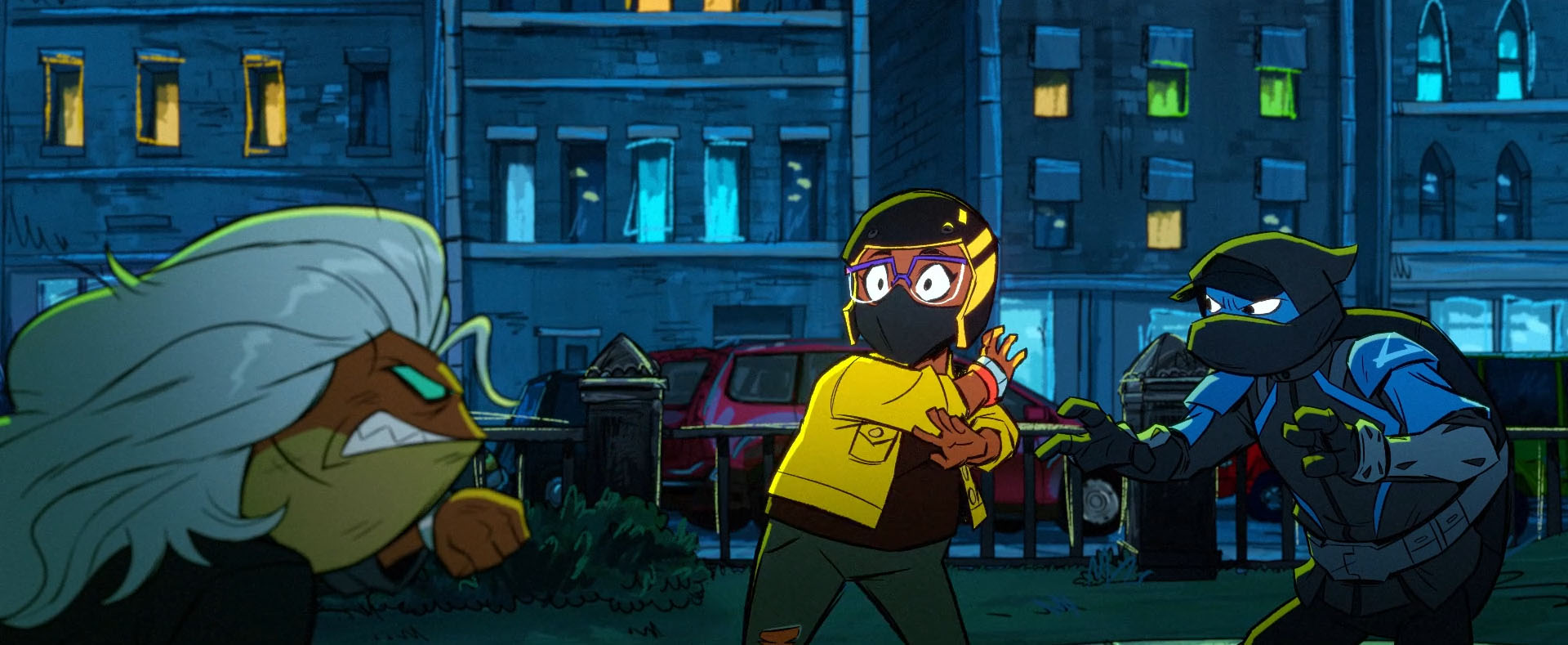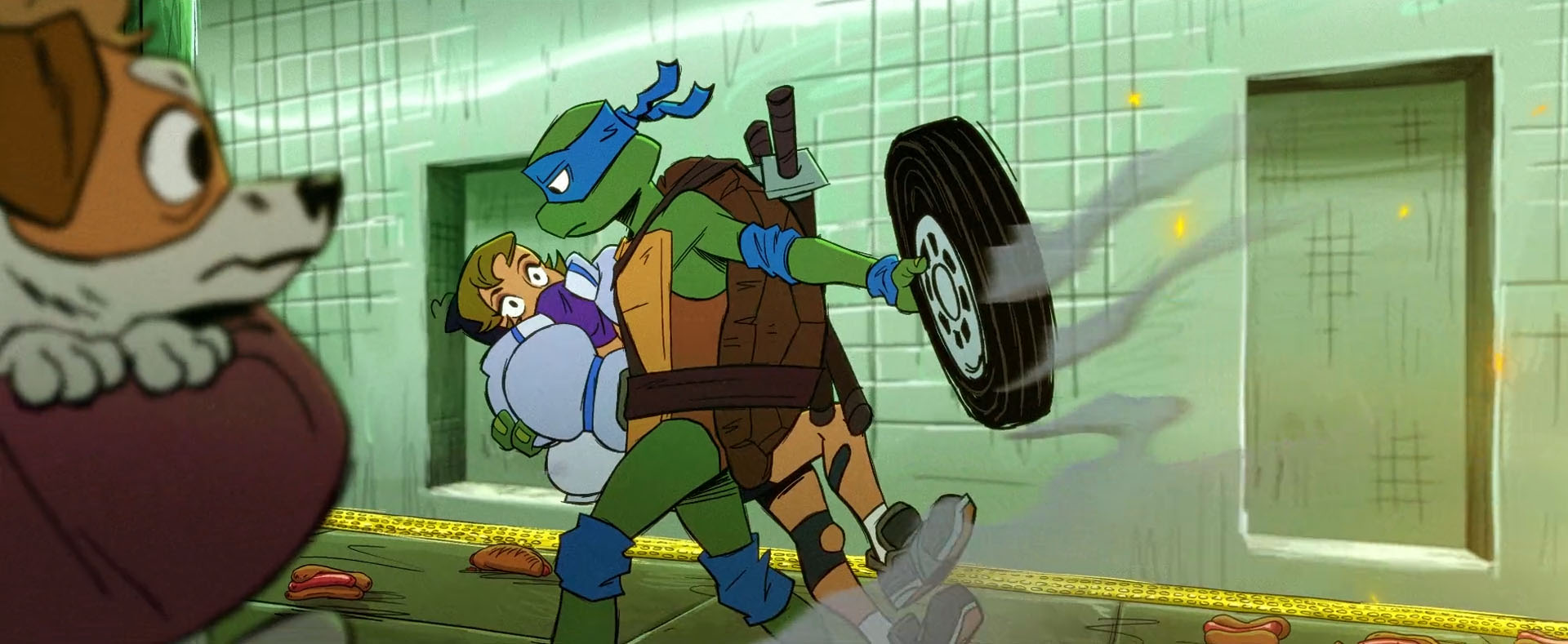 Quelques jours plus tard, le rongeur leva la punition. Les tortues retournèrent s’amuser sur les toits de la ville. Pendant un jeu de Raphael et de Michelangelo, un shuriken tomba dans la rue, et se ficha dans le casque d’une jeune femme du nom d’April O’Neil. Choquée, la lycéenne insultait les tortues depuis le trottoir. Elle n’avait pas vu qu’un malfrat dérobait son scooter. Leonardo partit récupérer le véhicule, avec l’aide de ses frères, qui ne voulaient pas trop s’en mêler. Le chef estimait que c’était leur devoir et voulait plaire à cette humaine tout à fait charmante. Les quatre frères eurent raison de toute une bande de voleurs cachés dans un hangar. Il s’agissait de leur premier vrai combat. April entra et découvrit les tortues. Elle n’eut pas vraiment peur, ils l’avaient aidé à retrouver son scooter ! La jeune femme avait des tonnes de questions à leur poser sur leurs origines. Elle était rédactrice du journal de son lycée, et espérait pouvoir percer avec cette interview, à défaut d’élucider le mystère de Superfly. Les tortues s’y opposaient. Elle devait rentrer chez elle pour ne pas inquiéter sa mère. Tout comme les tortues. La jeune femme leur donna son numéro puis partit.
