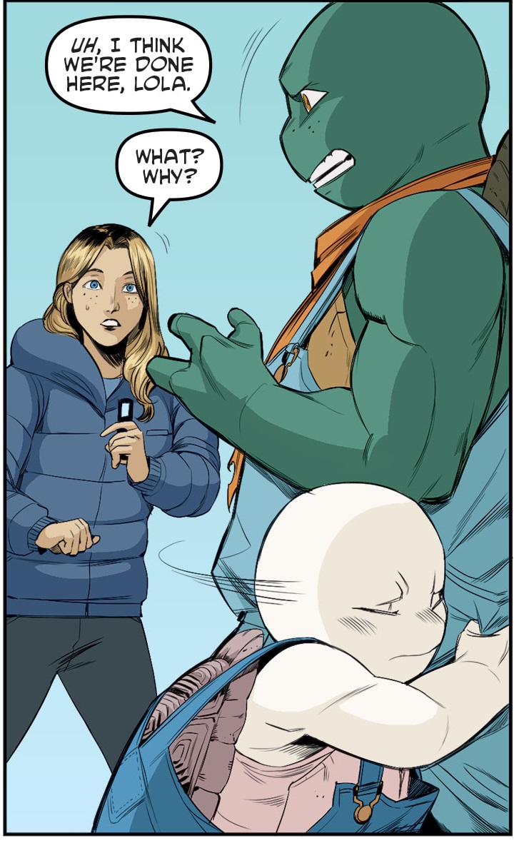 Ainsi, la journaliste se rendit à Mutant Town et posa quelques questions à la première personne qu’elle trouvait, Michelangelo. Si la tortue était plutôt intéressée au début, elle fut très vite ravisée en voyant les questions dérangeantes sur ses origines et ses capacités et préféra s’en aller voyant que Lola n’avait aucune limite et posait même des questions déplacées à la jeune Lita (TMNT (Vol. 5) #109). Cet évènement le décida à créer sa propre émission de radio afin de garder le contact avec les mutants et éventuellement toucher les humains en dehors de Mutant Town.