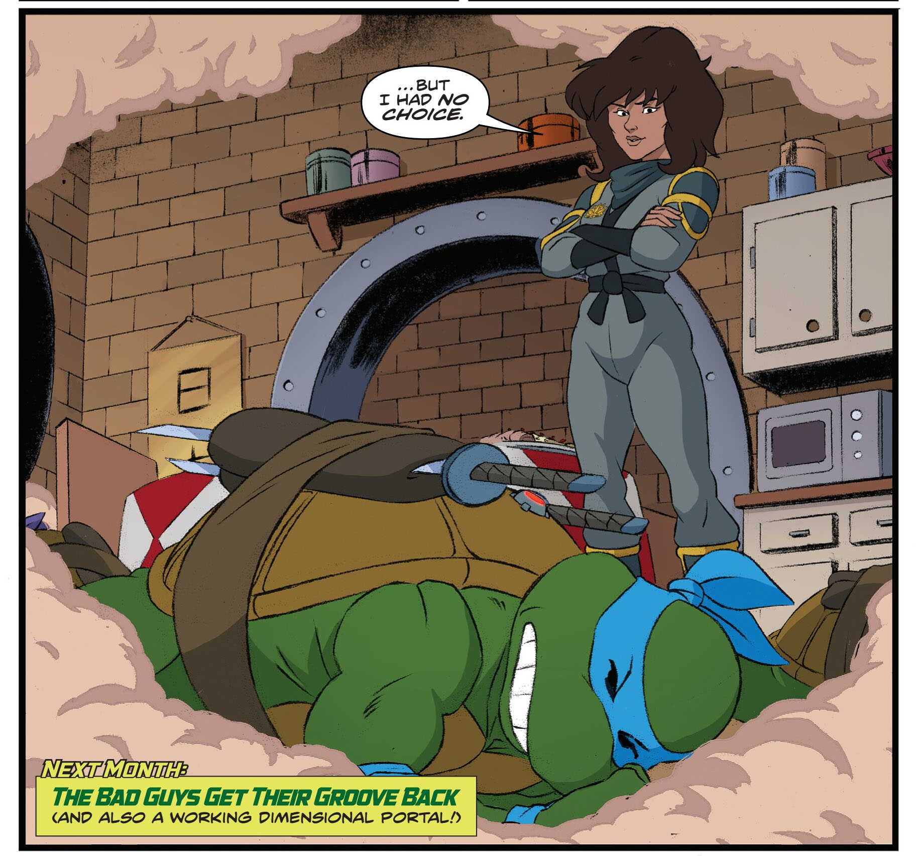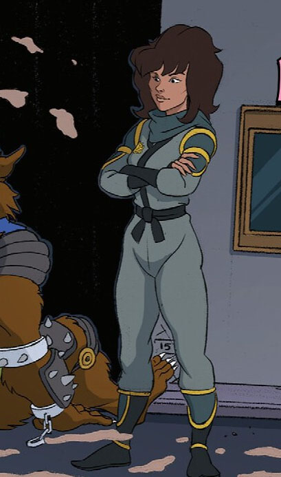 Loin de vouloir se détacher des tortues, elle vint très vite leur livrer une pizza directement dans leur cuisine, déguisée en livreur. Elle y avait caché une fleur de lotus dans la boîte. Ce n’était qu’un au revoir (Attention au lotus, S3 E28).