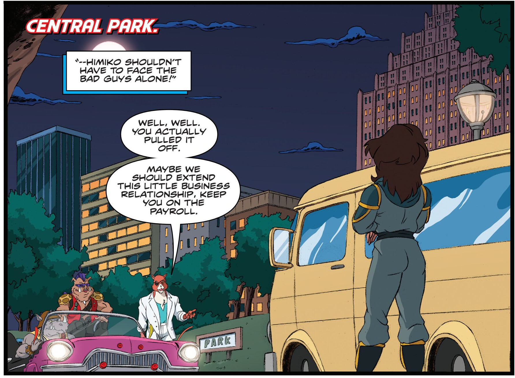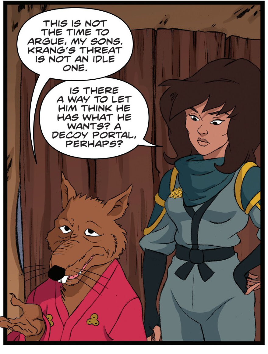 Splinter rentrait au même moment d’un voyage et neutralisa l’intruse. Après lui avoir expliqué ses motivations, le rat compris et décida d’aider la jeune femme avec ses élèves. Donatello lui confia son ancien portail interdimensionnel, peu performant. Himiko le donna à Old Hob tout en le menaçant s’il s’en prenait de nouveau à ses élèves (SMA #26).