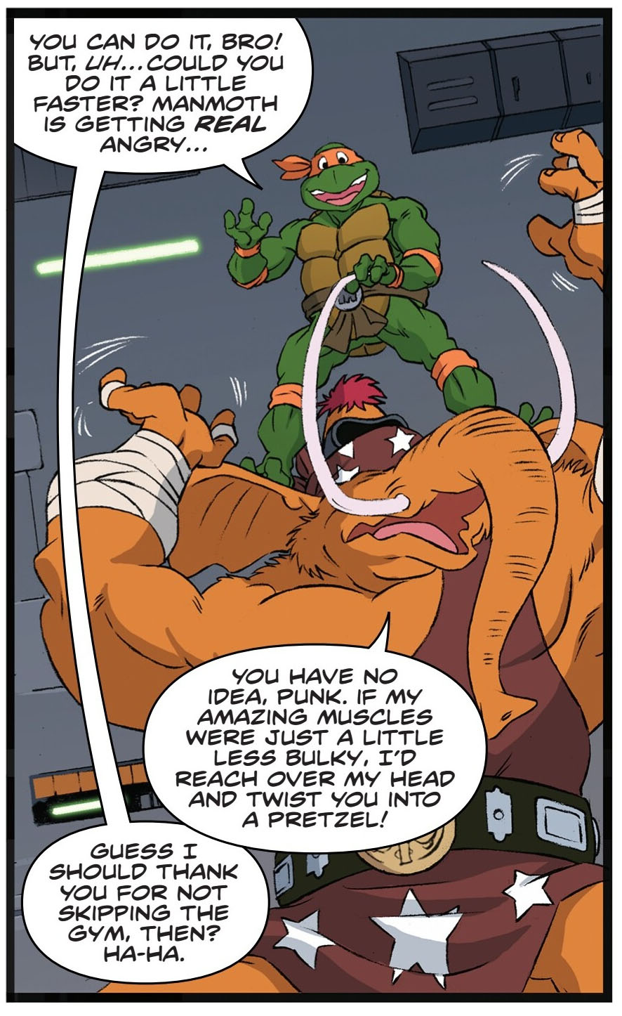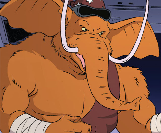 Manmoth était l’un des membres du Pantheon. On ignore tout de lui. Il est champion intergalactique de combat et préfère largement faire parler sa force que son cerveau (TMNT SMA #16).