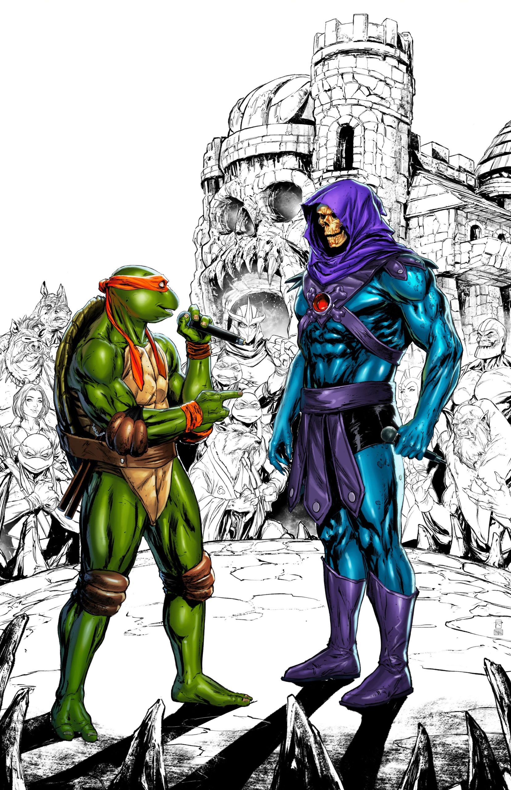When the Teenage Mutant Ninja Turtles came across Krang and Shredder making a deal with some otherworldly ‘demon-mage’ named Skeletor, things got hella-weird and they ended up in ETERNIA! It turns out, when you mix Ultrom mutagen with demon magic you get a nasty purple poison—and it’s brought Eternia to the brink of chaos. So, Leo, Raph, Donnie, and Mikey are teaming up with the Masters of the Universe to kick some blue boney butt. The only problem is…He-Man is missing in action.