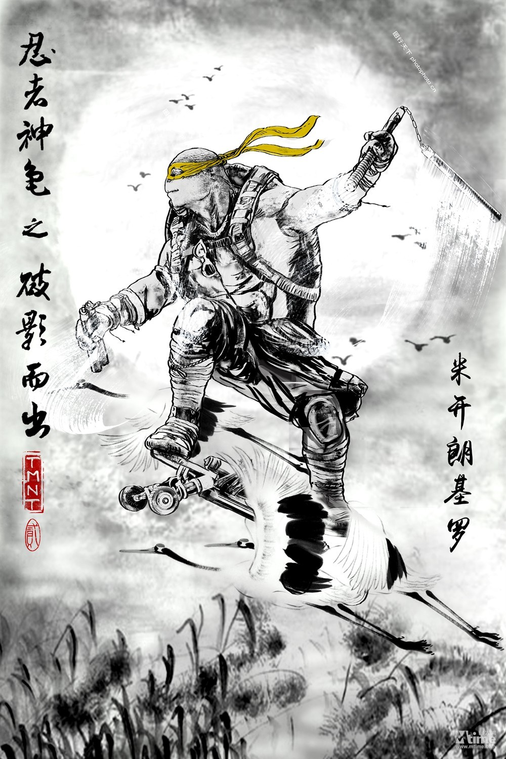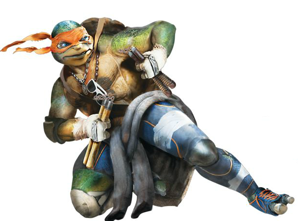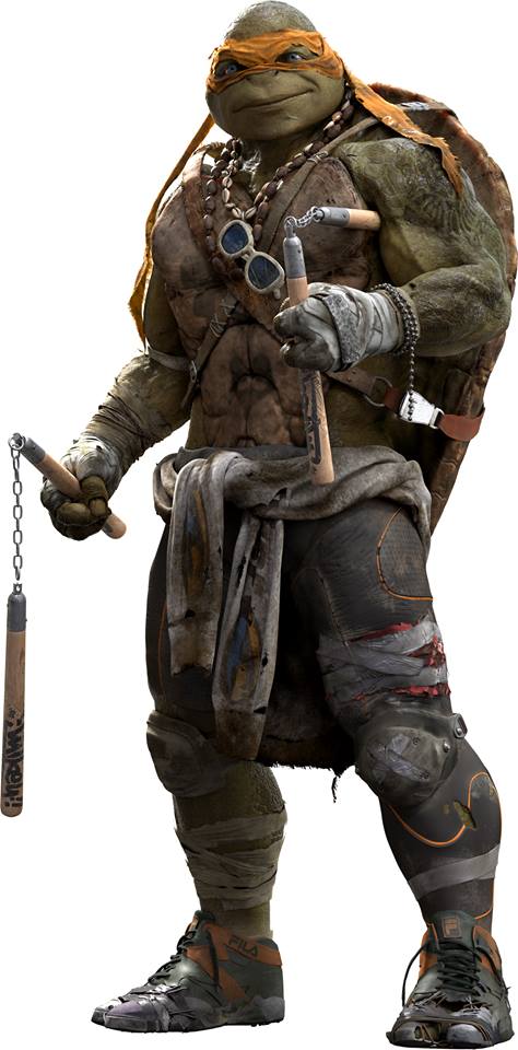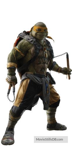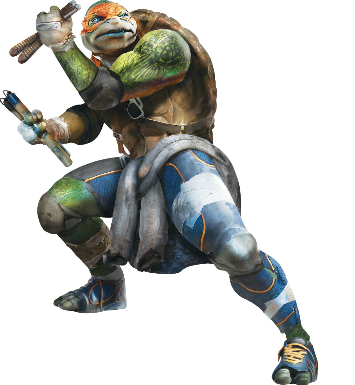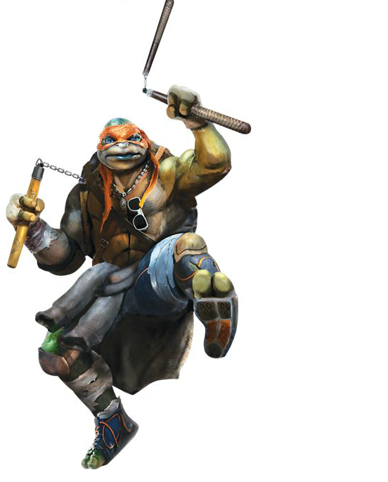 - La figurine de Michelangelo créée par Playmates Toys pour le film de 2014 est vendue avec un seul nunchaku, et un sansetsukon, alors que la figurine de 30cm est vendue avec ses deux nunchakus, chacun d’une couleur différente, comme dans le film. Il s’agit de l’un des éléments qui ont été retouchés dans le film au dernier moment, avant sa sortie, comme la figurine de Raphael in disguise.