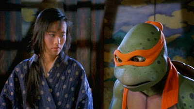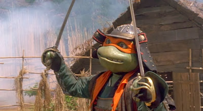À son arrivée dans le Japon médiéval, Michaelangelo eut la malchance d’atterrir à l’envers sur son cheval. Il se fit alors assommer par Mitsu, leader de la résistance contre le daimyō Norinaga. Retenu captif au village rebelle, le jeune ninja parvint à s’échapper et prit Walker, commerçant d’armes britannique monté à cheval, pour Clint Eastwood. Les tortues vinrent à son secours à ce moment. Une fois les envahisseurs du village partis, il sauta dans une maison en flamme pour y sauver le petit Yoshi, qu’il ramena. Leonardo lui fit du bouche-à-bouche pour le sauver. Ce geste permit aux tortues de se faire adorer des villageois.