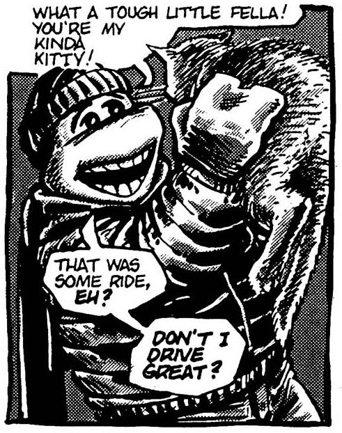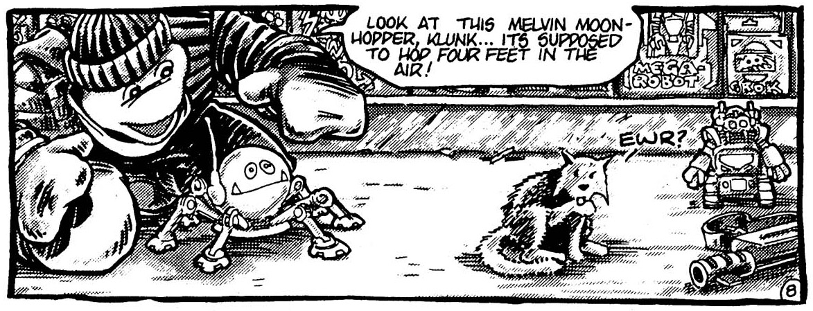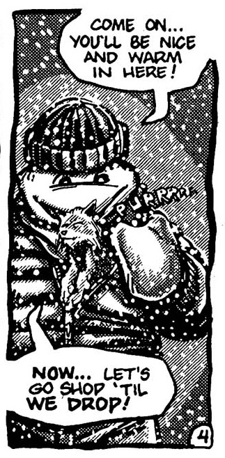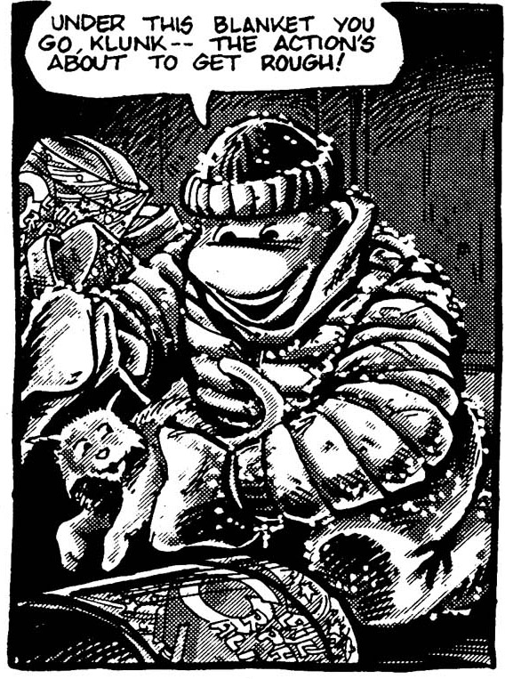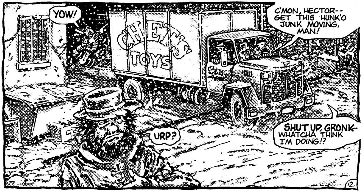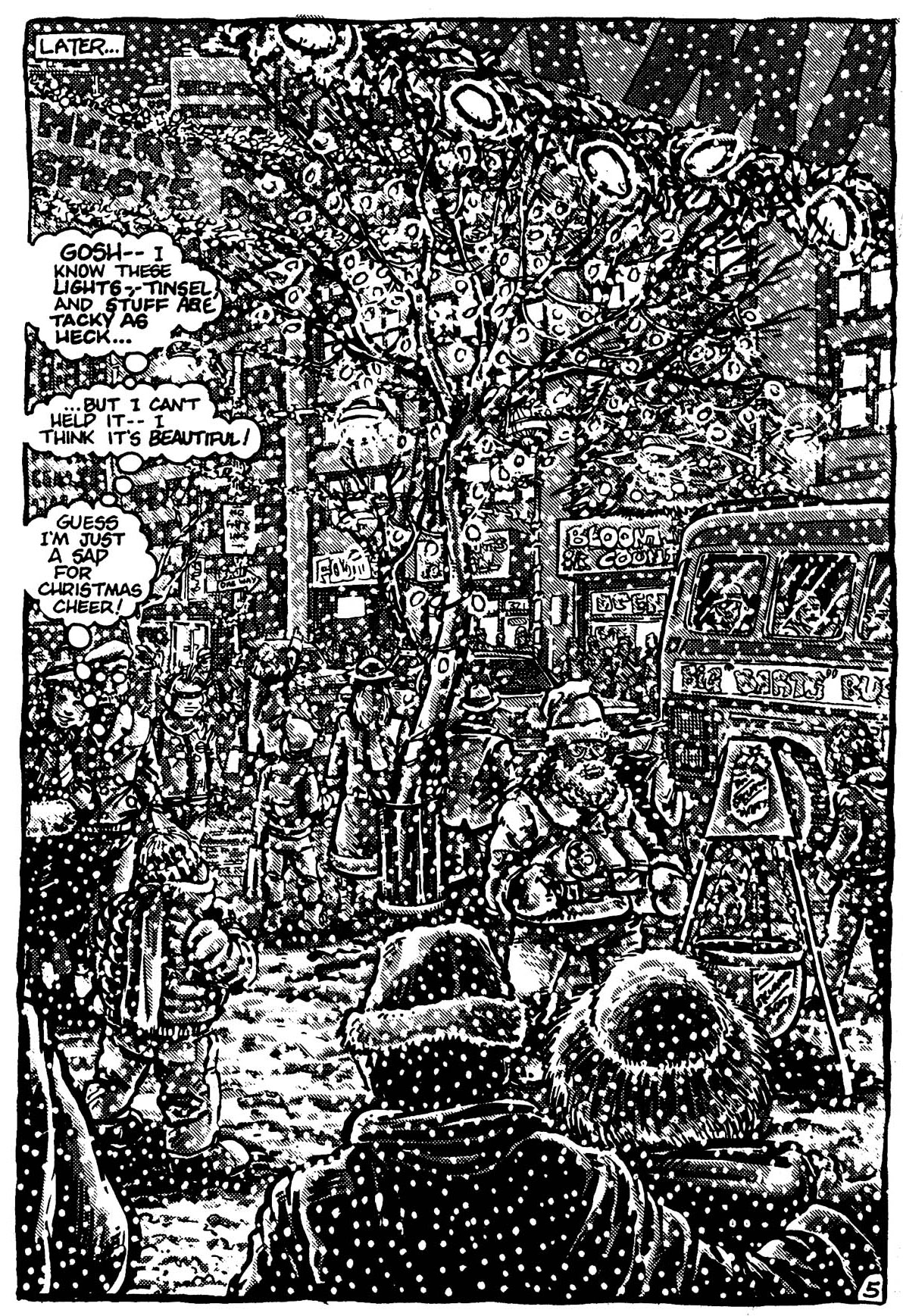 Tandis que les tortues vivaient chez April, Michaelangelo partit profiter des périodes de Noël pour voir New York sous la neige. Il rêvait d’être un humain normal qui s’amuse avec une luge ou à faire du patin sur glace. Partant pour les magasins, il fit la rencontre de Klunk, un petit chat qu’il adopta immédiatement. Après cela, il alla dans une magasin de jouet pour s’amuser mais découvrit des voleurs qui cherchaient à s’emparer d’une cargaison destinée à un orphelinat. Il les prit en chasse et arrêta le camion. Il demanda après cela à ses frères et à April de l’aider à distribuer les jouets à l’orphelinat (TMNT Micro-series : Michaelangelo).