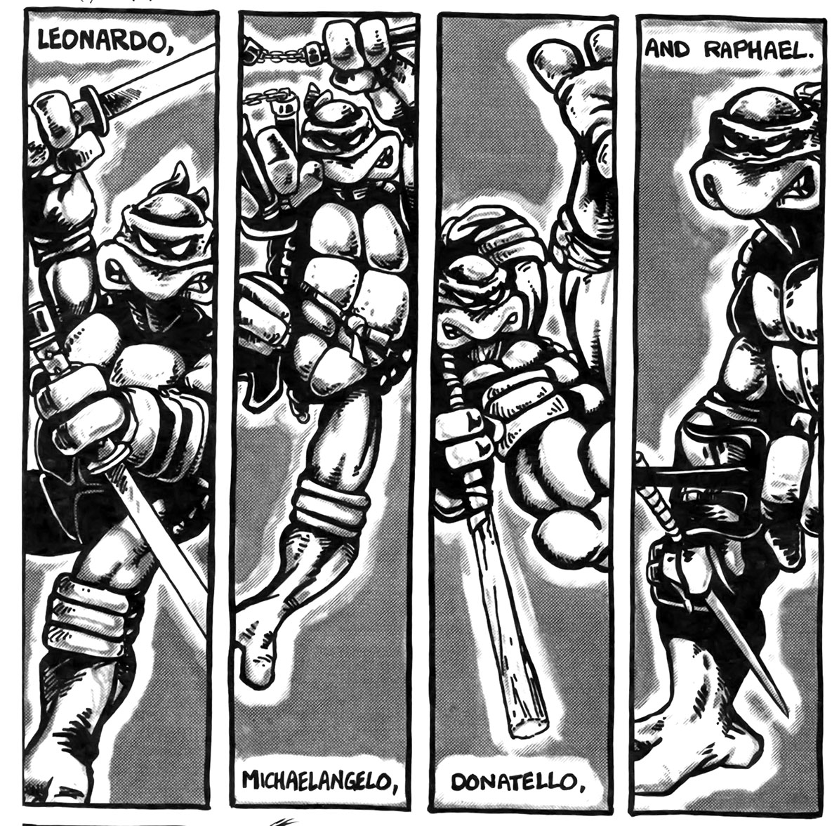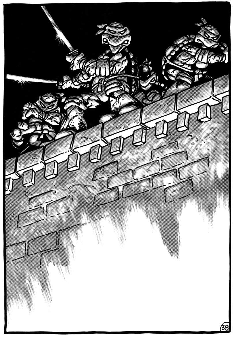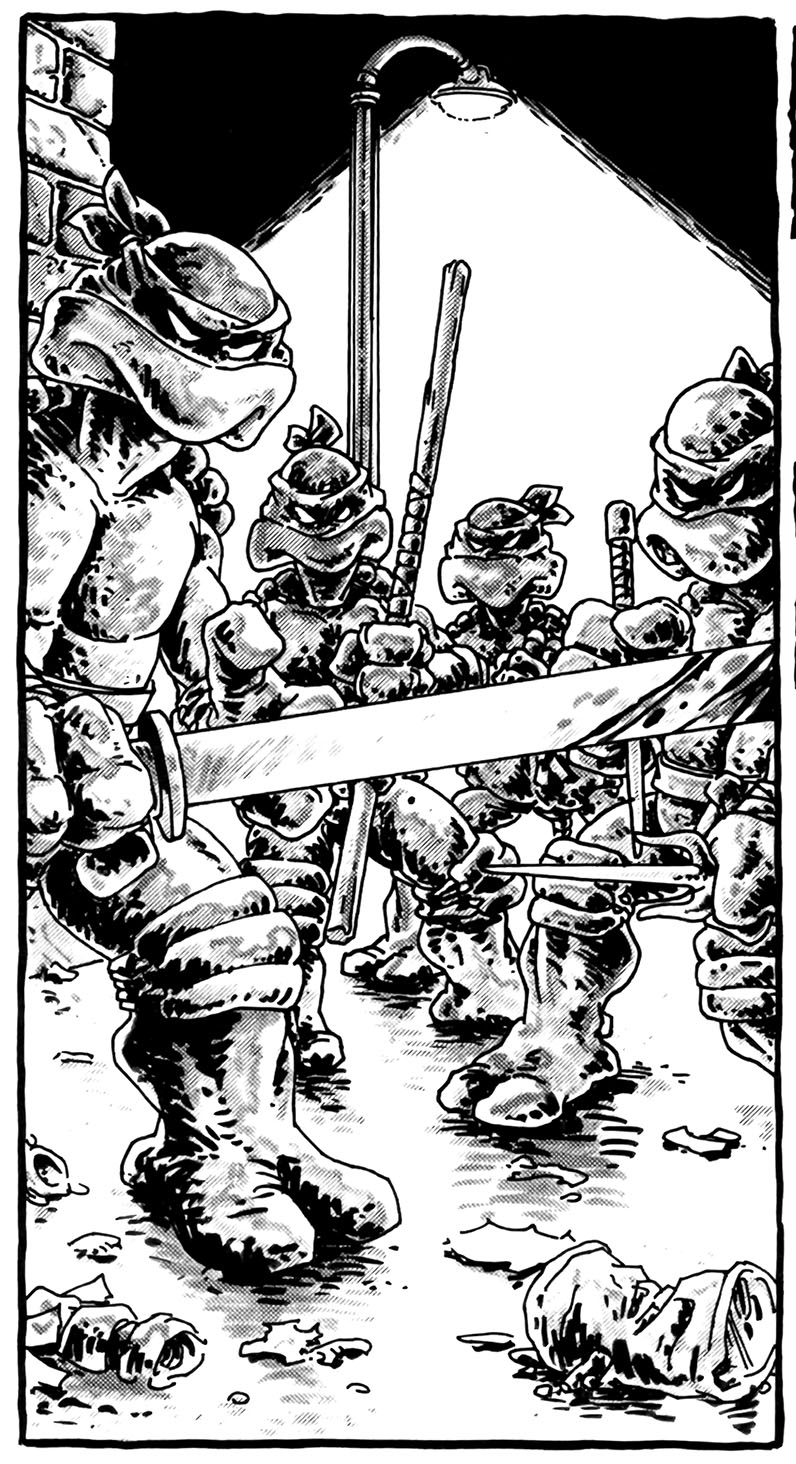 Michaelangelo et ses frères affrontèrent le Foot Clan sur les toits de la ville. Après avoir balayé les ninjas Foot, Oroku Saki, devenu Shredder, se dressa face aux tortues. Finalement, elles réussirent à venir à bout de l’homme, qui se suicida, espérant entraîner les quatre jeunes ninjas avec lui (TMNT (Vol. 1) #1).