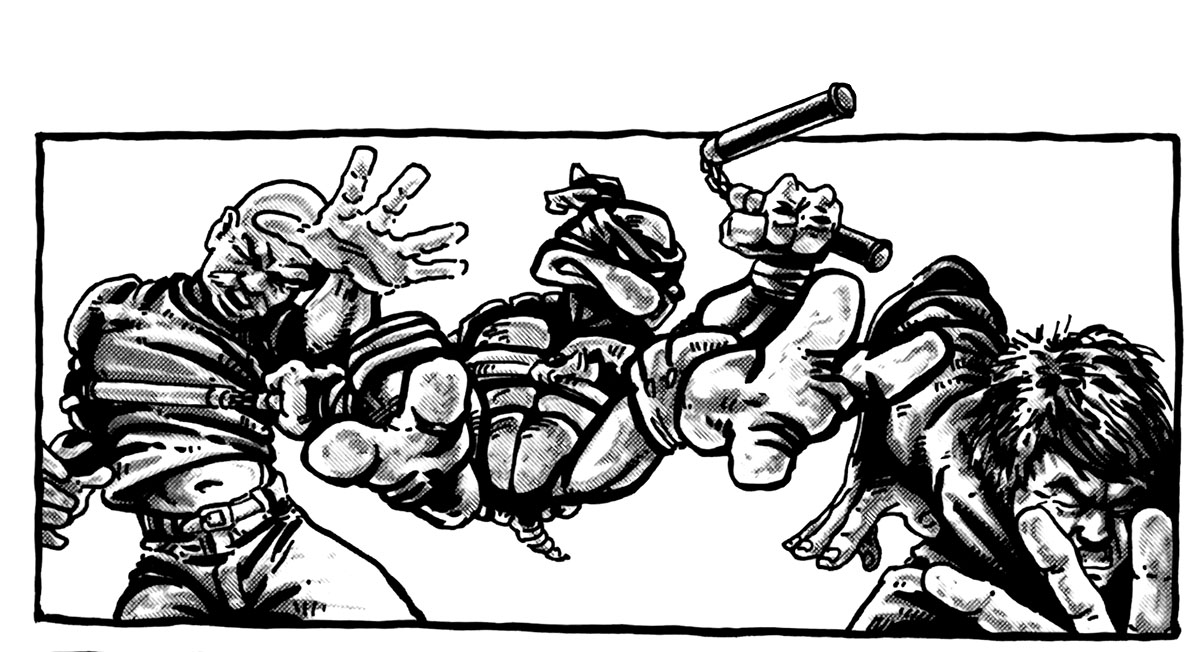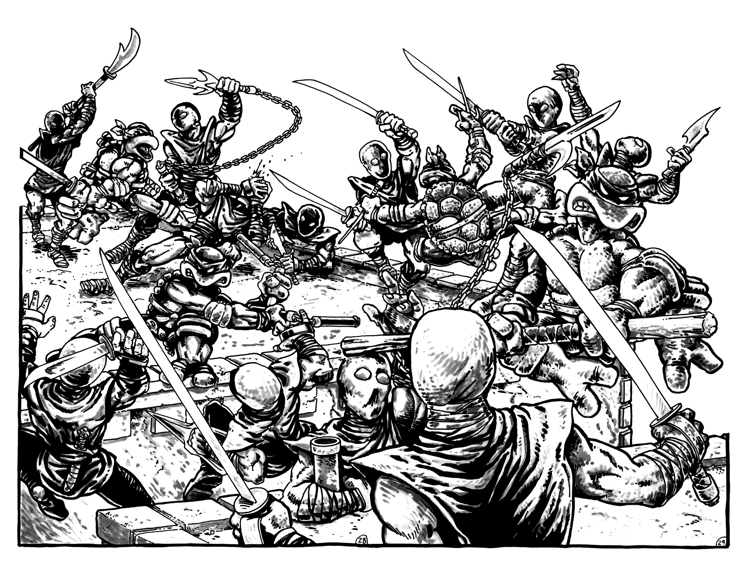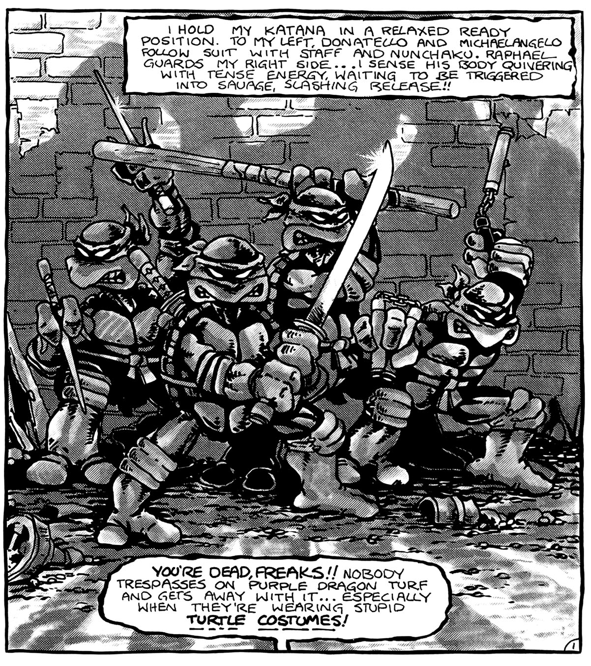 Michaelangelo et ses frères affrontèrent le Foot Clan sur les toits de la ville. Après avoir balayé les ninjas Foot, Oroku Saki, devenu Shredder, se dressa face aux tortues. Finalement, elles réussirent à venir à bout de l’homme, qui se suicida, espérant entraîner les quatre jeunes ninjas avec lui (TMNT (Vol. 1) #1).