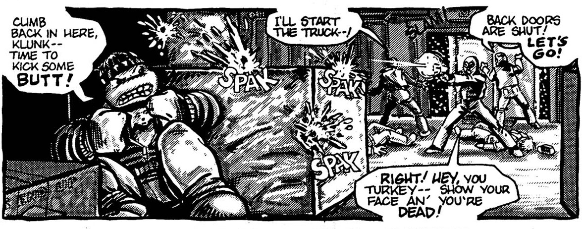 Les tortues furent envoyées sur la planète D’Hoonib et arrivèrent à côté du professeur Honeycutt, devenu un robot fugitif aux yeux de la Fédération. Elles neutralisèrent les soldats qui les attaquaient avant de s’enfuir avec le Fugitoid. Il s’avéraient qu’il devait construire un transmat pour l’état politique de la planète – ce qu’il refusait car pouvant ouvrir les portes à de terribles guerres. Honeycutt accepta de les aider et ils partirent tous les cinq à la recherche d’un vaisseau où embarquer. Mais ils furent attaqués par des triceratons et le Fugitoid capturé. Les tortues volèrent à son secours, étant la seule solution pour espérer revenir à New York. Les tortues embarquèrent, sans le savoir, dans un vaisseau triceraton qui partait pour sa base mère (TMNT (Vol. 1) #5).