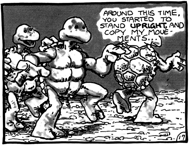 Michaelangelo est la première tortue à avoir été dessinée. Il est né de l’imagination de Kevin Eastman en novembre 1983 (en savoir plus), Si la tortue était loin de ressembler à sa version définitive, nous reconnaissons quelques signes distinctifs, comme les nunchakus.- Il est la tortue la moins explorée des quatre dans l’ensemble de l’œuvre. Leonardo est le chef et possède quelques traits très prononcés. Donatello est la tortue préférée de Peter Laird et Raphael la tortue préférée d’Eastman. Le rôle de Michaelangelo est très faible dans les deux premiers volumes. Cela peut expliquer la décision du changement de comportement de la tortue dans le Volume 4, devenant un personnage bien plus complexe.