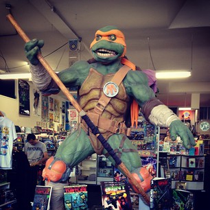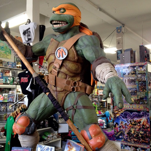 Note: Le costume de Michelangelo présenté ici en exposition se trouve au Meltdown Comics d’Hollywood.