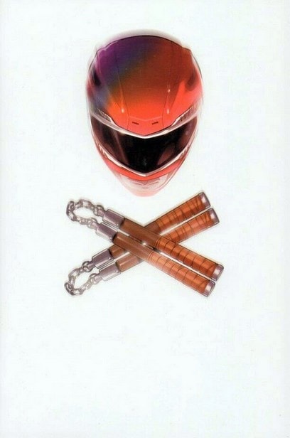 - Goni Montes, qui a dessiné les couvertures B à E, est connu chez Boom ! Studios pour avoir réalisé un certain nombre d’autres illustrations pour le titre principal des MMPR, dans ce style, avec un ranger en tenue, tenant son casque devant lui.