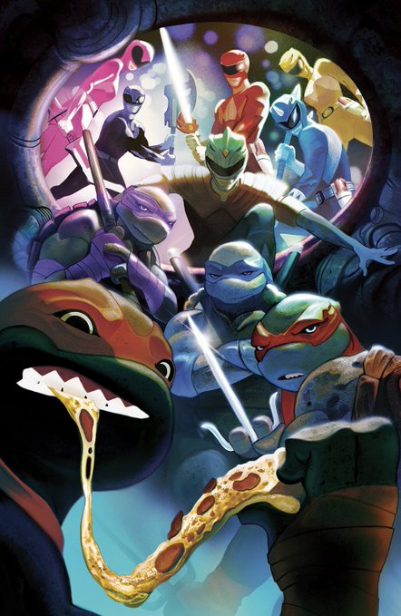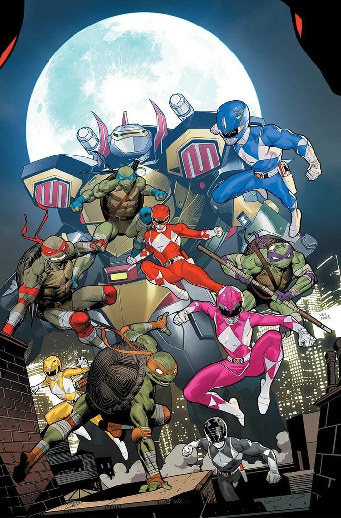 « It’s the ultimate showdown between the Mighty Morphin Power Rangers and Teenage Mutant Ninja Turtles, up against the joint forces of Rita Repulsa and Shredder! Cowabunga! »