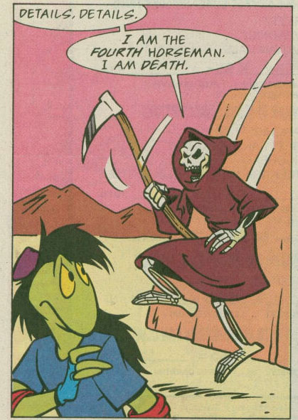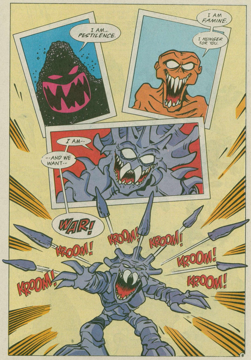 Les tortues et les Mutanimals faisaient face aux trois créatures qui se présentaient sous les noms de Pestilence, Famine et War. Entendant cela, Splinter faisait immédiatement le rapprochement entre eux et le mythe des cavaliers de l’apocalypse. Mais où était donc le quatrième ? War s’avançait vers ses opposants et tirait une salve de pics de roche venant de son propre corps pour entamer le combat. Le quatrième membre de leur équipe, Death, arrivait à son tour. Il s’agissait du squelette qui avait enlevé Juntarra et qui s’était allié à M. Null. Retirant son manteau, il sortait sa faux qu’il agitait autour de lui.