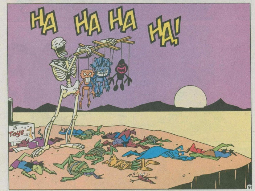 Death prenait un malin plaisir à jouer avec les marionnettes de ses trois compagnons. Des petites figurines plates des tortues et des Mutanimals jonchaient le sol à ses pieds…