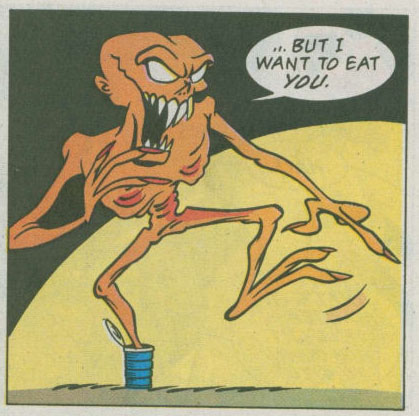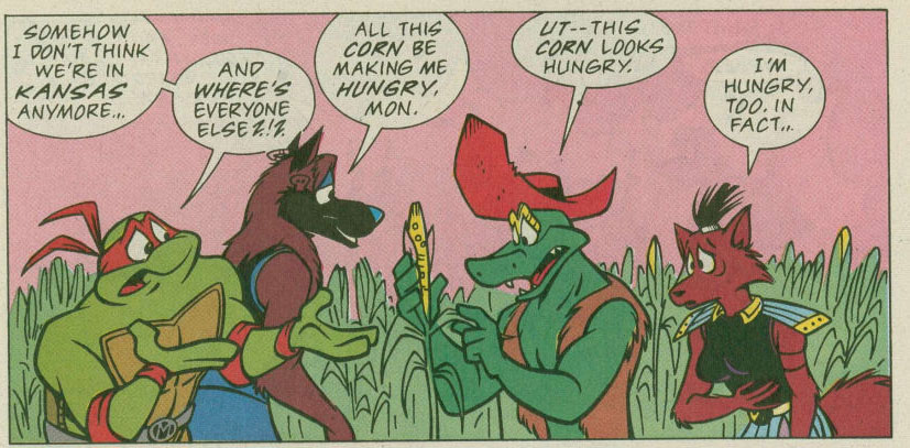 Enfin, Michaelangelo, Leatherhead, Ninjara et Dreadmon étaient projetés dans un champ de maïs. Ils mourraient de faim. Non loin, des personnes maigres et affaiblies faisaient la queue devant un camion de vivres. Arrivés jusqu’à une femme qui distribuait la nourriture, les compagnons étaient devenus affreusement maigres. La dame leur disait qu’il n’y avait plus de nourriture. Ce qu’il restait serait donné au Président. Les portes du camion se refermaient et il quittait le lieu en trombes. Dans sa course, le véhicule laissait s’échapper une petite conserve que les quatre compagnons s’empressaient d’ouvrir comme des sauvages. Reprenant leurs esprits, ils se rendaient compte à quel point cela ne leur ressemblait pas. Ils se faisaient manipuler. Dreadmon se proposait de l’ouvrir avant de redistribuer à parts égales le contenu. Mais c’était Famine qui en sortait ! Prenant une forme gigantesque, il menaçait ses ennemis de les dévorer. Une fois tous tombés au sol, il les emportait avec lui.