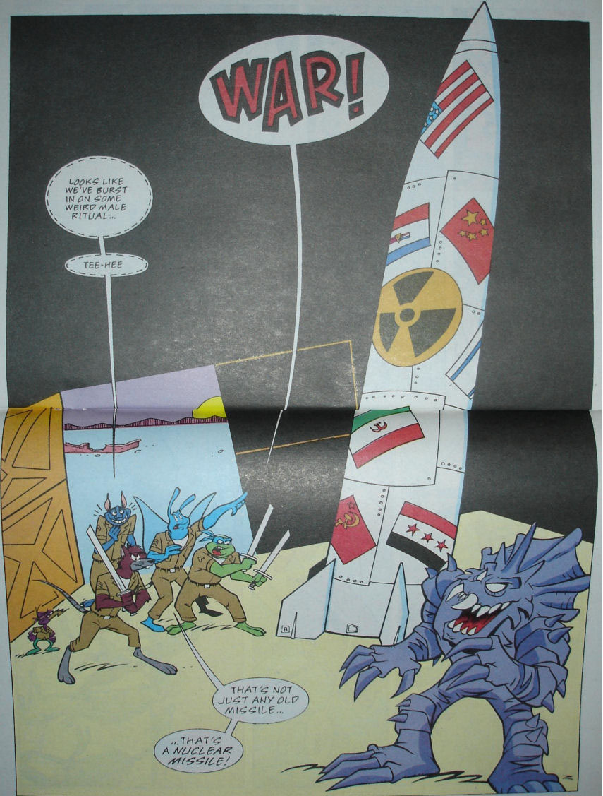 Splinter, Wingnut, Screwloose et Man Ray se retrouvaient plongés dans la guerre, habillés en militaires. De tirs se faisaient entendre. Pour ne pas être touchée, l’équipe se réfugiait dans une tranchée. Un soldat s’y trouvait et leur ordonnait de partir dans une grange à proximité. Il soupçonnait que l’ennemi y cachait un missile. Cela semblait clairement être un piège. Mais comme le soulignait Splinter, il s’agissait peut-être de la seule manière de se sortir de ce « jeu ». Les cinq compagnons couraient en direction de la grange. Leonardo ouvrait la porte d’un coup de pied. À l’intérieur se trouvait War, à côté d’un immense missile. Ou plus exactement, de la bombe atomique ! Engageant le combat, les compagnons se rendaient compte de la puissance de leur adversaire qui les repoussait systématiquement. Soudain, ils entendirent un sifflement dans le ciel. La grange était dévastée par un tir de missile allié. War sortait des décombres avec les corps inanimés de ses adversaires sous les bras.