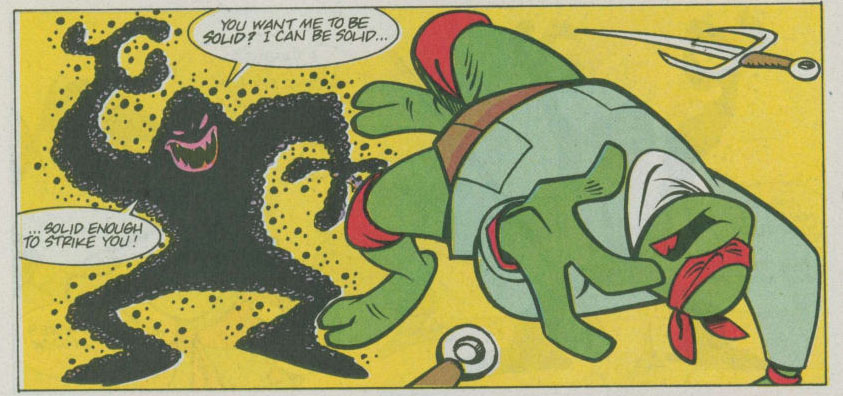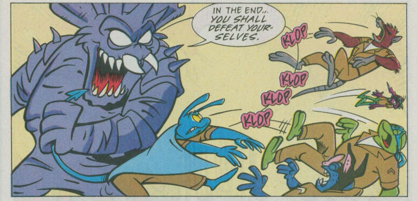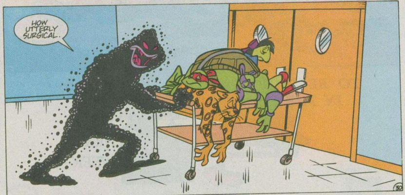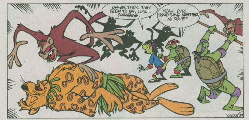 ans attendre, Donatello se jetait sur lui et de son bâton, frappait son bras. Celui-ci tombait au sol, laissant une sorte de gélatine mauve sortir de son corps. Pestilence ne sentait rien et envoyait la substance liquide de son corps sur la tortue pour la repousser. Raphael, inquiet d’avoir affaire à un ennemi liquide, cherchait un point faible. Il était repoussé à son tour. Soudain, une nuée de singe sautait sur la créature, libérés par Jagwar. Cela laissait du répit aux compagnons pour reprendre leurs esprits. Mais sur le point de quitter la pièce, ils se rendaient compte que les singes, qui étaient venus à bout de Pestilence, se retournaient contre eux, comme s’ils avaient été infectés. Jagwar refusait de leur faire du mal. Il était le premier à tomber. Les primates voyaient leurs corps devenir liquides. Ils n’avaient bientôt plus que l’apparence de créatures simiesques qui recouvraient les tortues et les Mutanimals. Tombés, les compagnons étaient amenés à l’extérieur par Pestilence sur un brancard…