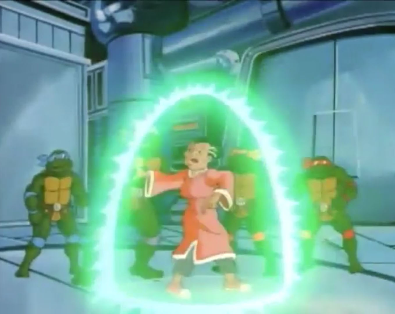 Miyako avait été retenue dans un champ de force. Jaloux et furieux de la tournure des choses, Shredder renvoya sa mère de là où elle venait (Vague de chaleur, S4 E5).