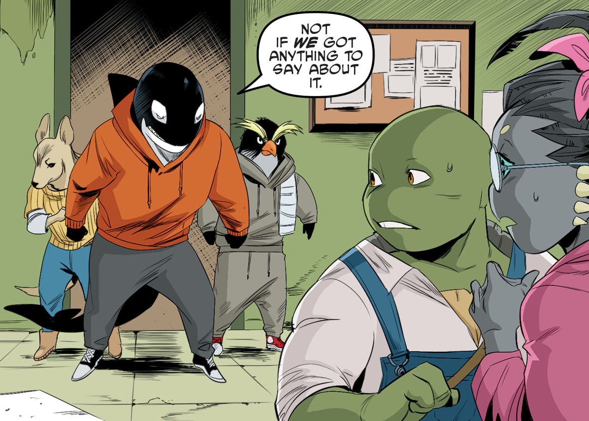 Parallèlement, la salamandre dut faire face à une situation très compliquée. De nombreux mois après sa mutation, elle s’était enfin décidée à parler à sa famille avec caméra. Voyant son apparence, ses parents avaient préféré couper les ponts, sous le choc (TMNT (Vol. 5) #111). Cette réaction, qu’elle comprenait dans le fond, l’avait dégoutée et en avait fait part lors d’une séance de soutien aux mutants. Elle accusait notamment Old Hob d’avoir violé son corps et ses droits à travers cette mutation. Ses études tombaient à l’eau, sa famille ne voulait plus d’elle, sa vie d’humaine avait drastiquement changée. La séance dégénéra très vite avec les soutiens des Mutanimals qui voyaient leur nouvelle vie comme une chance et un nouveau départ. Malheureusement, personne ne s’écoutait parler (TMNT (Vol. 5) #112).