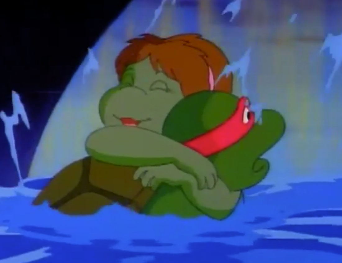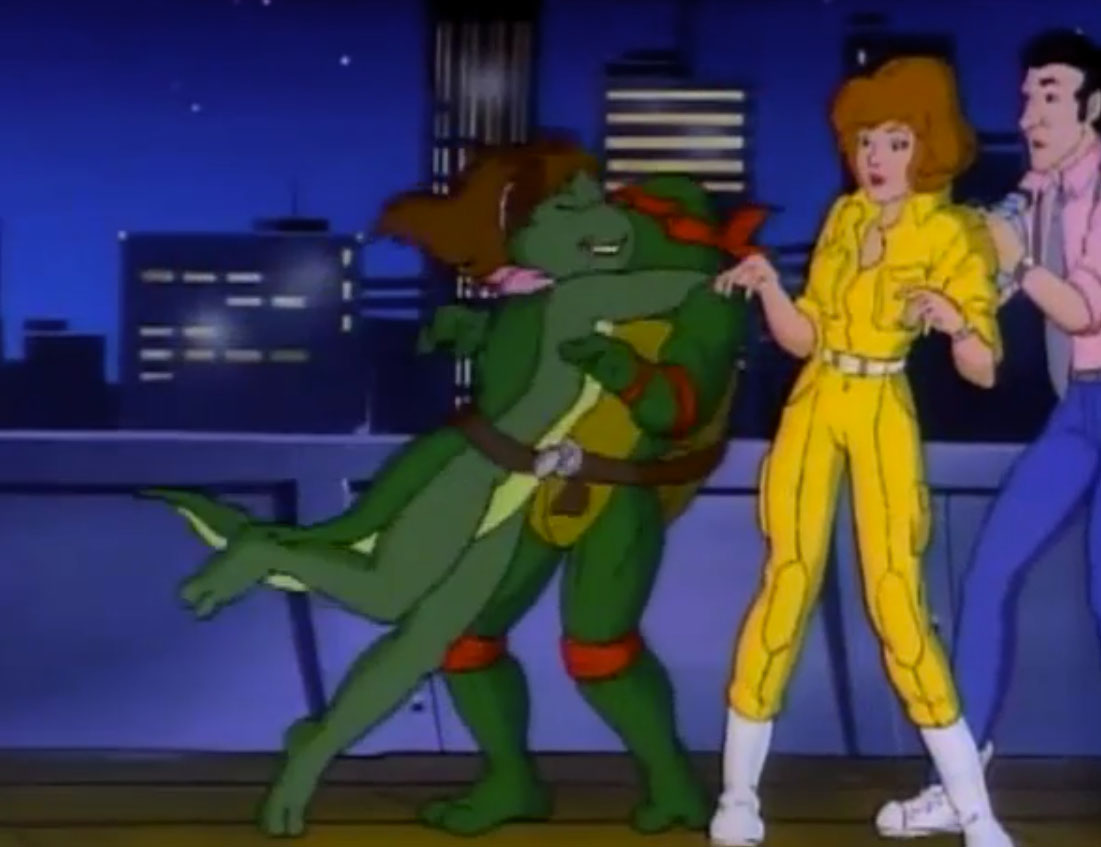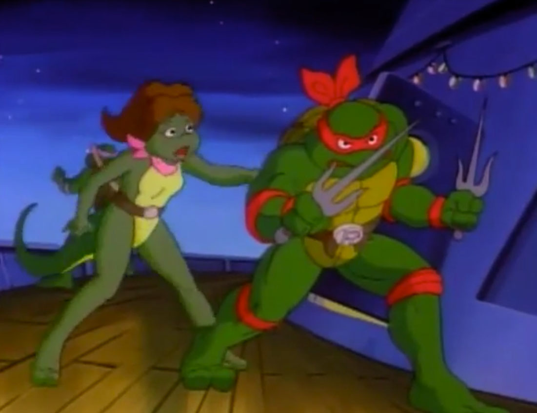 De retour à New York, Raphael repensait à Mona Lisa et regrettait d’avoir laissé une si bonne amie derrière lui. Il ignorait qu’April avait invité la salamandre dans le repaire des tortues. Elle les attendait avec des pizzas (Raphael en croisière, S4 E17).